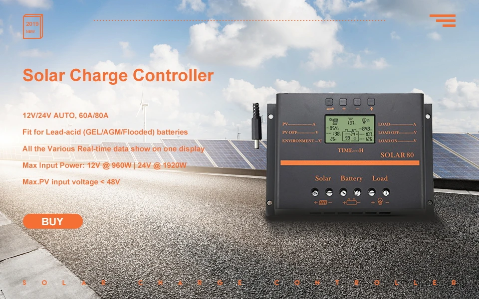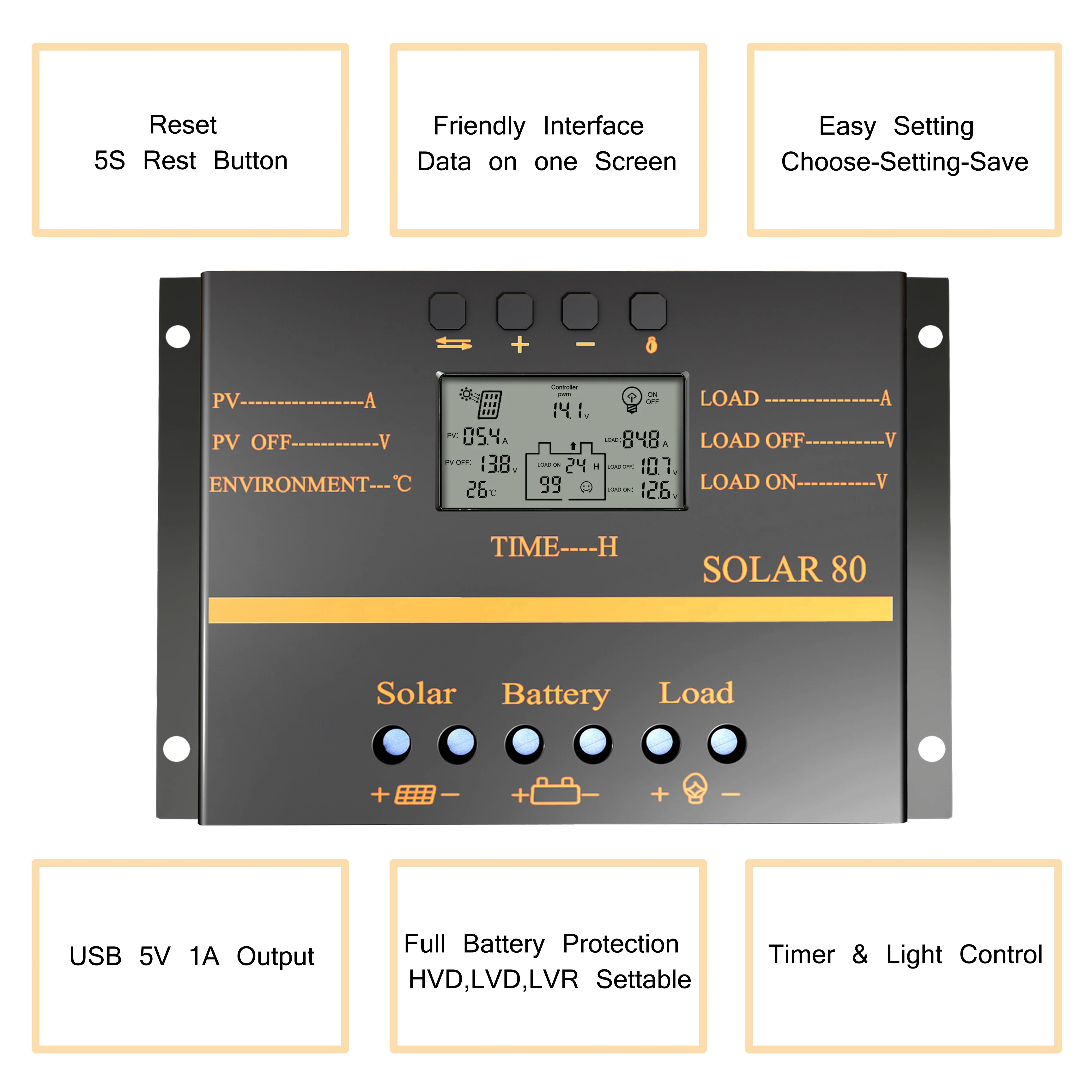 Эта модель-Контроллер заряда и разряда PWM 80A, подходит для свинцово-кислотных, гелевых, герметичных, затопленных аккумуляторов 12 В и 24 В