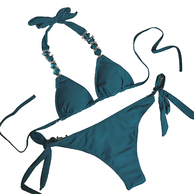 2022 Женский Летний Пляжный комплект бикини из 2 предметов, халтер, стразы, брифы с заниженной талией и боковой завязкой, купальник