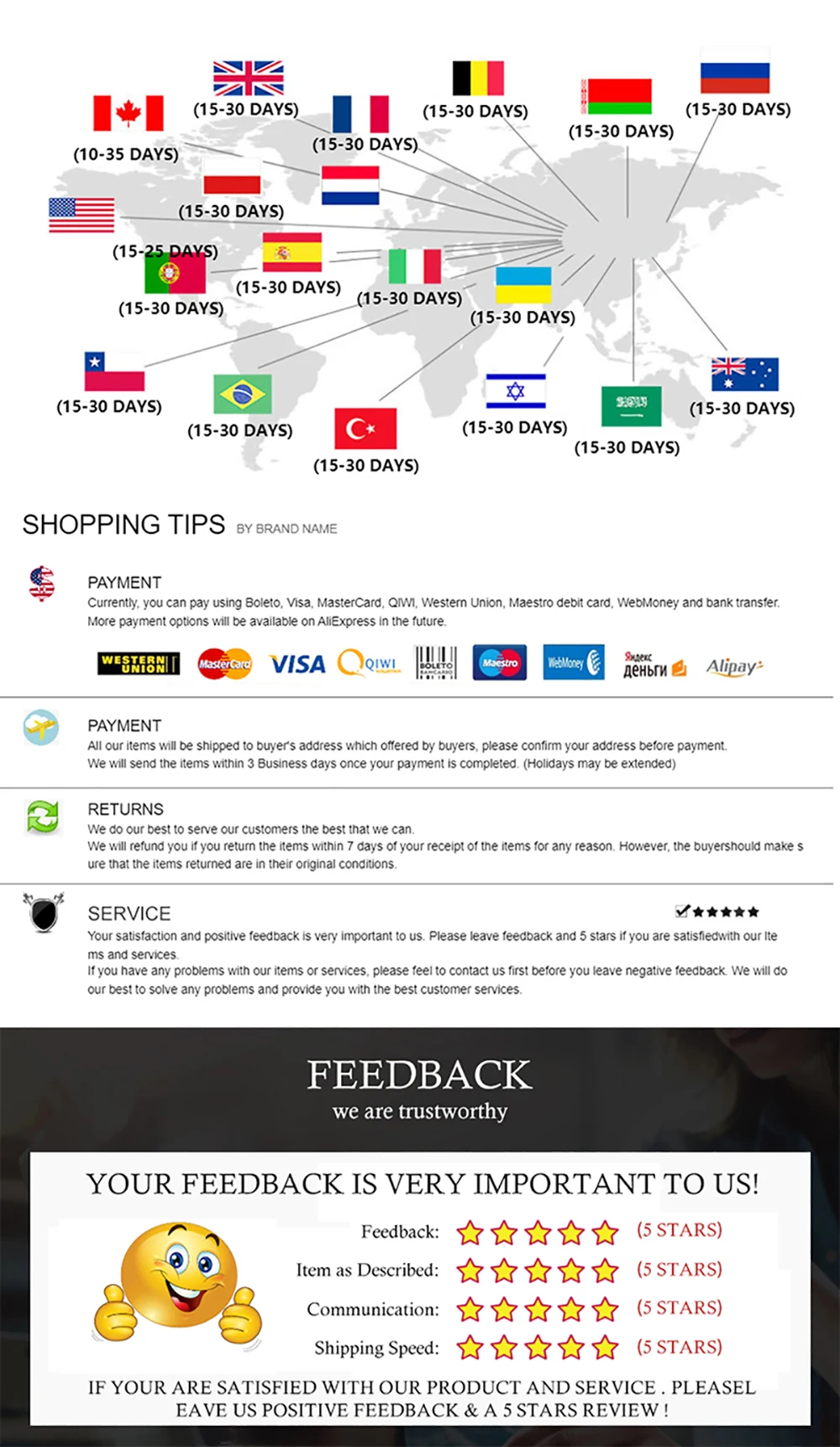 3. Пожалуйста, свяжитесь с нами, прежде чем открывать спор или оставить нам комментарий с низкой звездой. Так как свяжитесь с нами напрямую, это лучший способ найти решение, чтобы Вы остались довольны. Мы делаем все возможное, чтобы сделать каждого клиента счастливым.