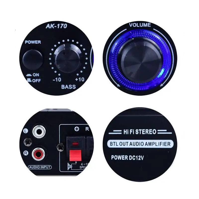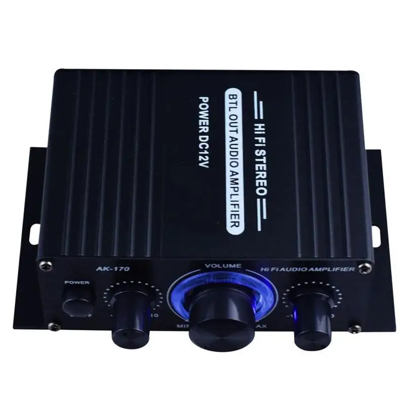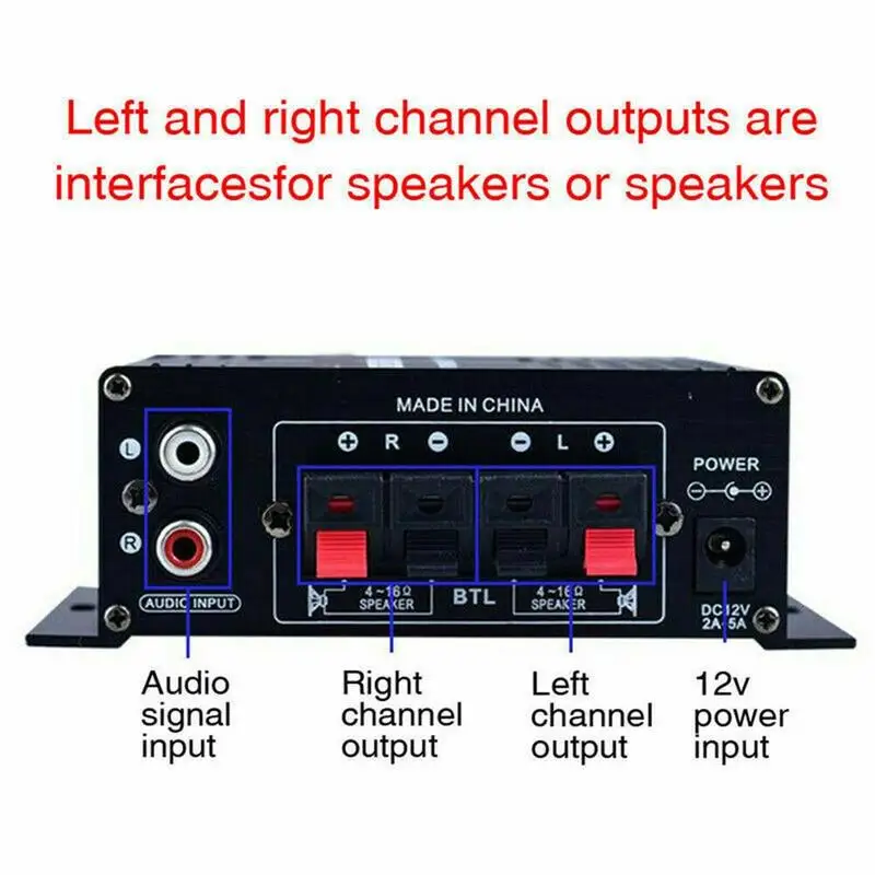 Мини HIFI аудио усилитель мощности. Два основных канала выхода.Выходы левого и правого каналов являются интерфейсами для динамиков или динамиков.Низкое Искажение обеспечивает более четкий, сильный и мощный звук.Изготовлен из алюминиевого сплава, толстый, приятный на ощупь.Большой ручки спроектированы с синий светодиодный свет tomake продукты больше и красиво.Характеристики:Название продукта: усилитель мощностиЦвет: черныйМатериал: алюминиевый сплавВходное напряжение: 12 В постоянного токаМощность RMS: 20 Вт + 20 ВтМаксимальная мощность: 200 Вт + 200 ВтКанал: 2CHСопротивление нагрузки: 4-16ΩSNR: 90 дБЧастота: 20 Гц-20 кГцЧастота искажений: 0.01%Размер: около 125x75x40 мм (Д * Ш * В)Посылка включает в себя:1 шт. x усилитель мощности1 шт. Руководство пользователя