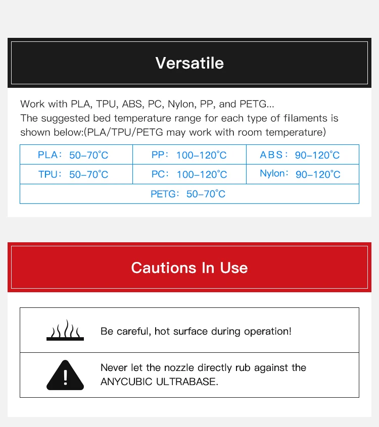 1. Предполагаемая температура кровати может варьироваться в зависимости от материала нити.2. Перед печатью, пожалуйста, правильно выровняйте кровать.3. Никогда не позволяйте соплу втирать непосредственно к ультрабазе.4. Очистите поверхность платформы спиртом/водой.(Примечание: Если вы протрите стакан спиртом, содержание алкоголя не должно превышать 30%.)
