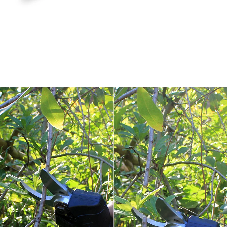Особенности:1. Аккумуляторные аккумуляторные секаторные ножницы для резки и обрезки ветвей в фруктовых садах, виноградниках.2. Лезвие, изготовлено из вольфрамовой стали, долговечное.3. Одна перезаряжаемая литиевая батарея большой емкости 9000 мАч для беспроводного использования.4. Ergonimic и удобная ручка.5. Низкий уровень шума, хорошая устойчивость к усталости.6. Гибкий в использовании, простой в повороте, безопасный и надежный, легкий в обслуживании, удобный для замены батареи и эксплуатации.7. Качество обрезки может соответствовать требованиям садоводства.