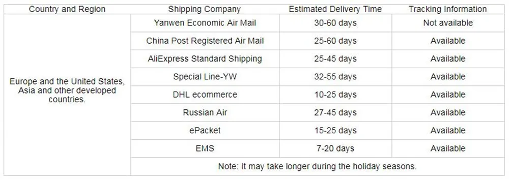 О доставке1. Мы обычно платим после подтверждения 3 доставки в течение дней.2. Мы используем авиапочту во все части мира (требуется) 25-60 дней) мы обычно предлагаем нашим клиентам выбрать экспресс-стандартную перевозку в качестве транспортировки, которая является самым дешевым и быстрым способом. Вы также можете отслеживать онлайн после транспортировки.3. Своевременная доставка-если вам 60, если вы не получили товар, который вы приобрели в течение нескольких дней, вы можете запросить полный возврат средств до того, как заказ будет завершен (когда вы нажмете, чтобы подтвердить полученный заказ или превысит период подтверждения). Для Бразилии требуется 90 дней доставки.