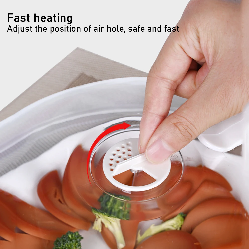 3. Регулируемые паровые вентиляционные отверстия: регулируемые паровые вентиляционные отверстия можно регулировать тремя способами: маленькие вентиляционные отверстия, большое вентиляционное отверстие или закрытое вентиляционное отверстие. Если вы хотите охладить свою еду перед едой, это отличный способ покрыть вашу еду от пыли и жуков.