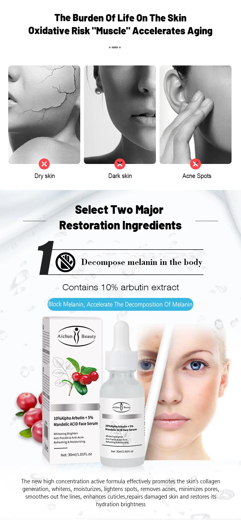 ▶1. Разложение меланина в организмеСодержит 1 0% экстракт арбутинаБлок меланина, замедляет разложение меланинаНовая активная формула с высокой концентрацией эффективно улучшает выработку коллагена, отбеливает, увлажняет, осветляет пятна, удаляет акне, уменьшает поры, разглаживает линии fne, усиливает кутикулы, восстанавливает поврежденную кожу и восстанавливает ее яркость гидратации.