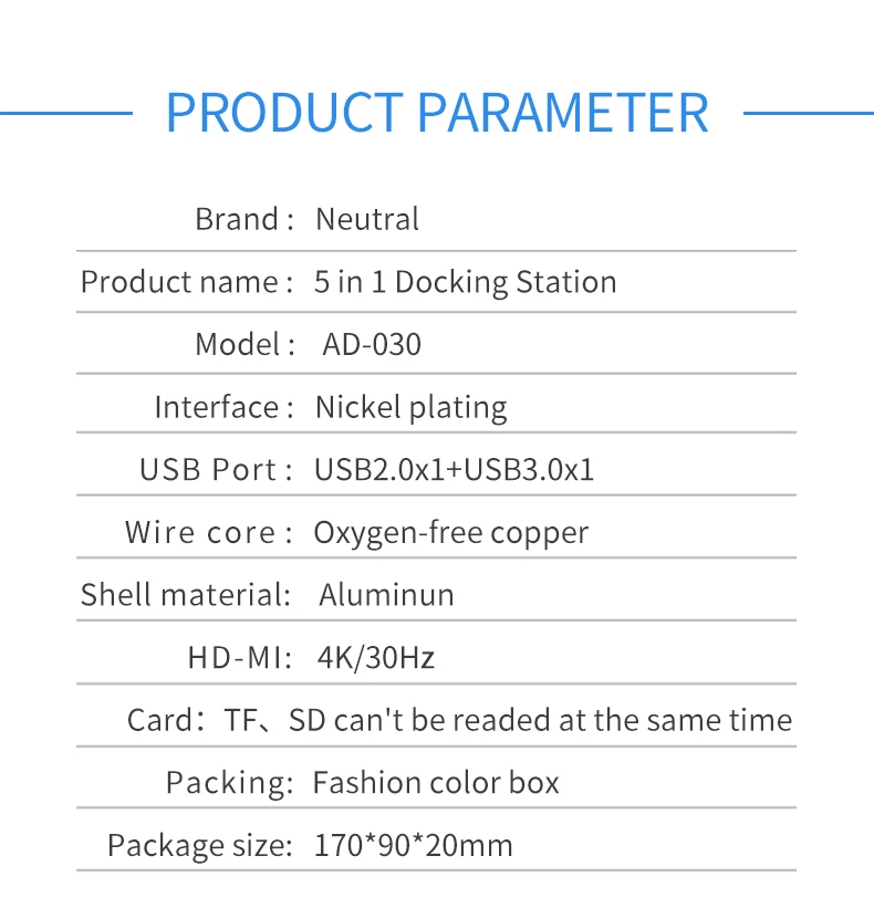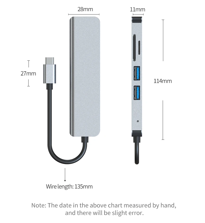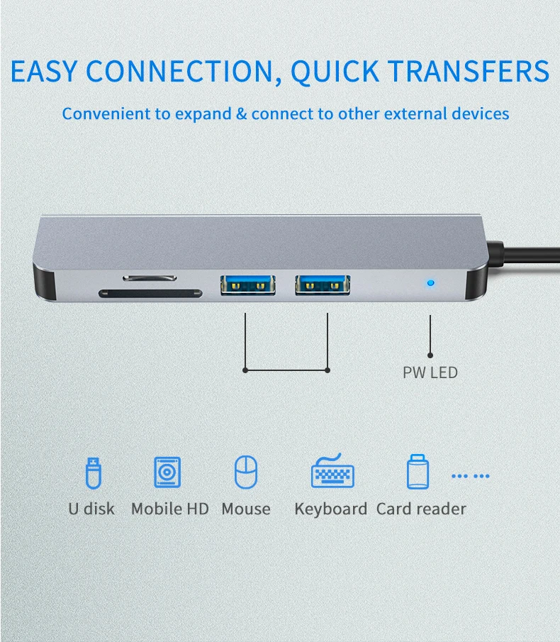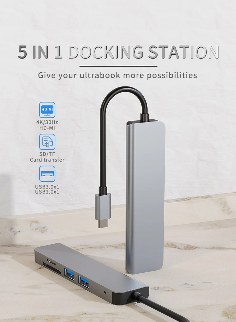 5 в 1 концентратор: USB 3,0*1 + USB2.0 * 1 + HDMI * 1 + TF кардридер * 1 + SD кардридер * 1