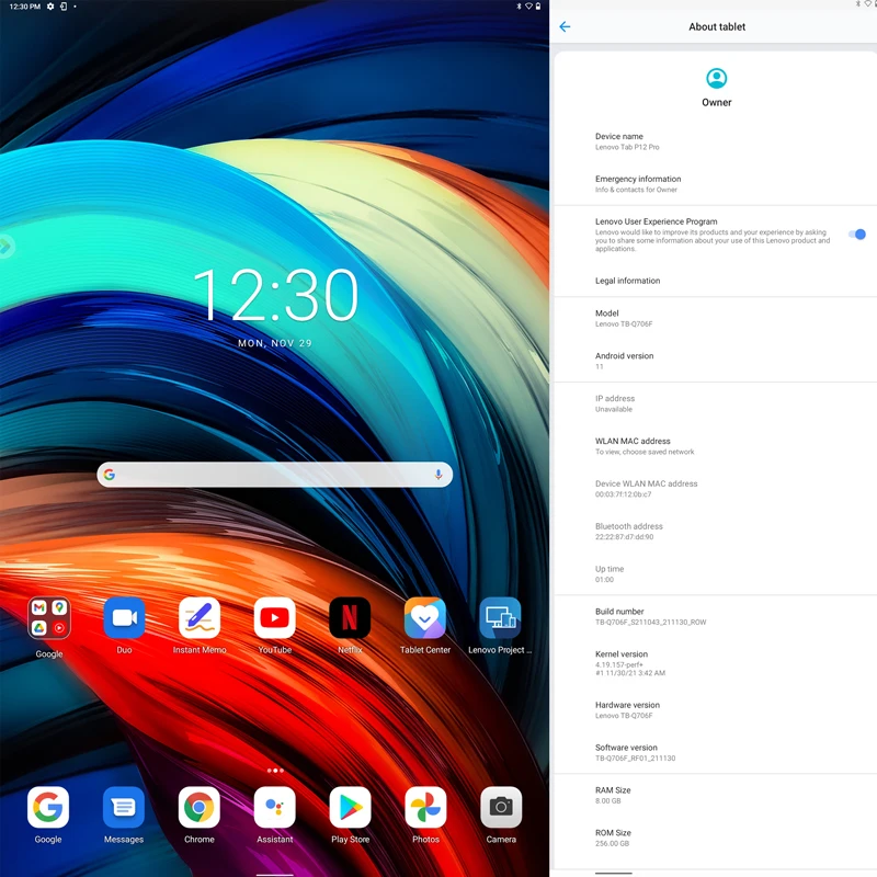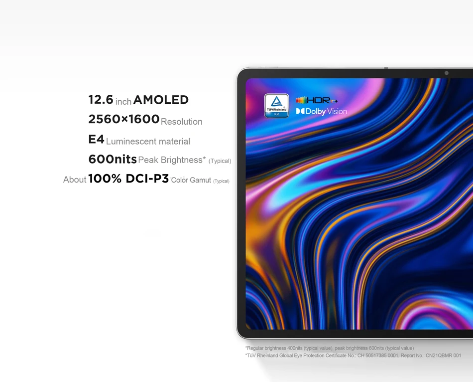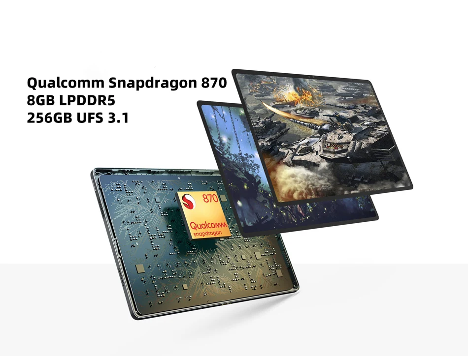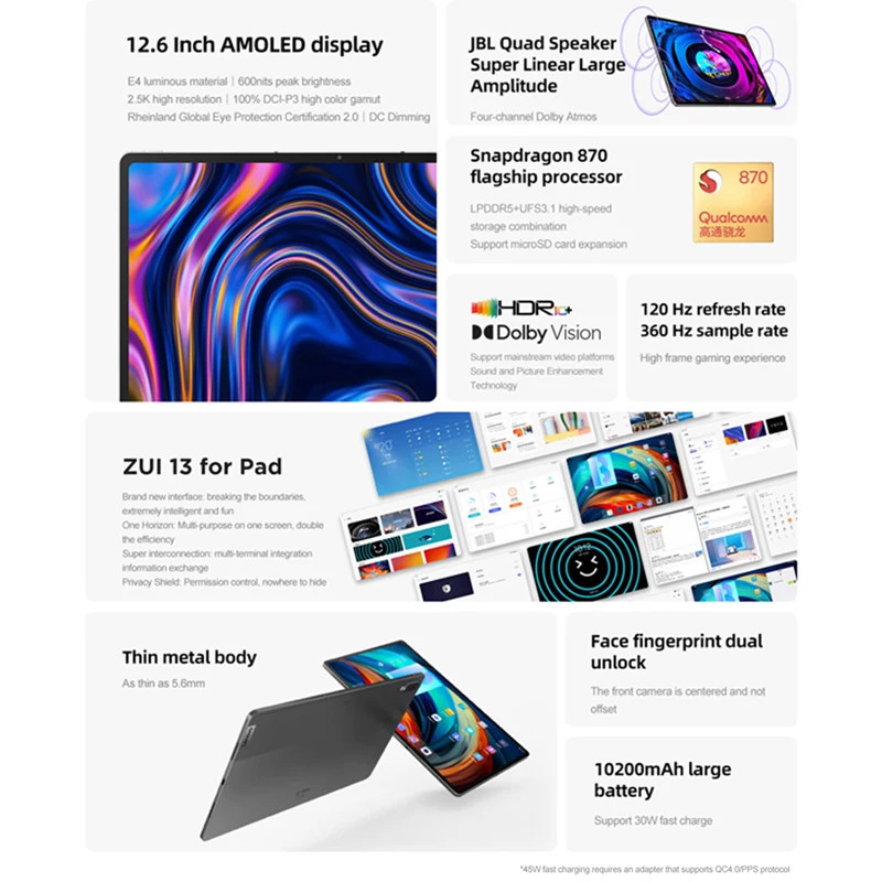 1. Операционная система Android 112. Восьмиядерный процессор Qualcomm Snapdragon 8703. 8 Гб RAM + 256 ГБ ROM4. 12,6 дюймов 120 Гц OLED экран, разрешение 2560x1600.5. Поддержка 2,4 ГГц/5 ГГц Wi-Fi и Bluetooth 5,26. Поддержка идентификации лица, Dolby Atmos, GPS + BDS7. Питание от литиевой батареи 10200 мАч8. Задняя камера AF 13 МП + фронтальная камера 8 МП