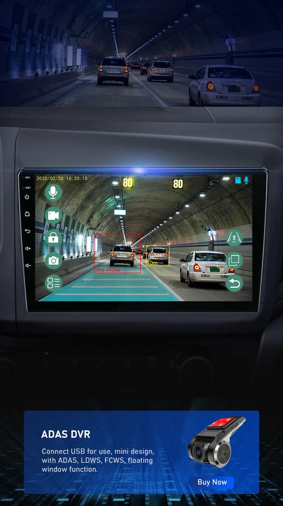 Поддерживает подключение к видеорегистраторУ ADAS. ADAS DVR имеет несколько встроенных ассистивных технологий вождения, вставляя высококачественную карту памяти TF для записи каждого момента вашего вождения.