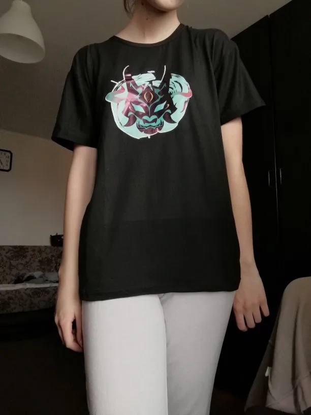 Футболка пришла быстро до Краснодара, по-моему за 1,5 недели. Размер брала L, так как боялась что будет мала. Выглядит как оверсайз, я довольна. Материал приятный, мягкий, скорее всего синтетика, швы ровные, нитки самую малость торчат, а так всё хорошо. Как видно на фото, немного просвечивает. Рисунок чёткий, переливается красиво, не знаю конечно как долго прослужит, но посмотрим. Буду ходить теперь и вспоминать о Сяо ~