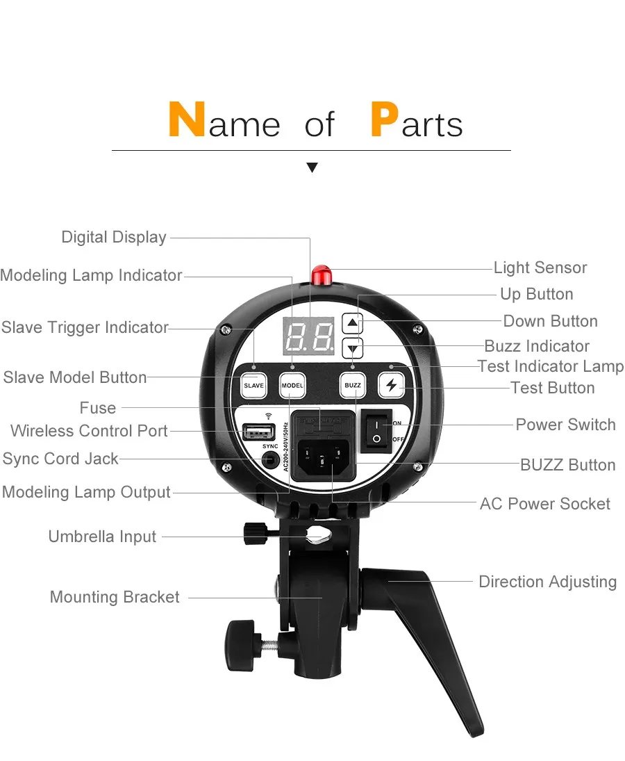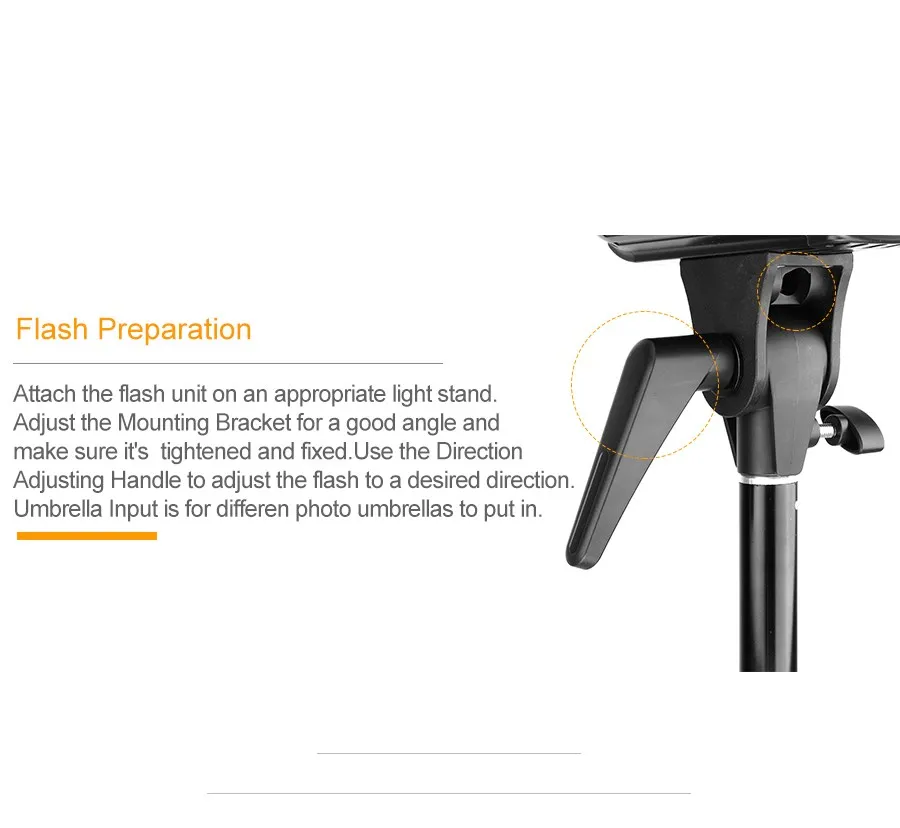 Прикрепите вспышки на соответствующий светильник-подставку. Отрегулируйте Монтажный кронштейн под хорошим углом и убедитесь, что он затянут и зафиксирован. Используйте регулировочную ручку направления для регулировки вспышки в желаемом направлении. Вход зонта предназначен для различных фото зонтов, чтобы положить в.