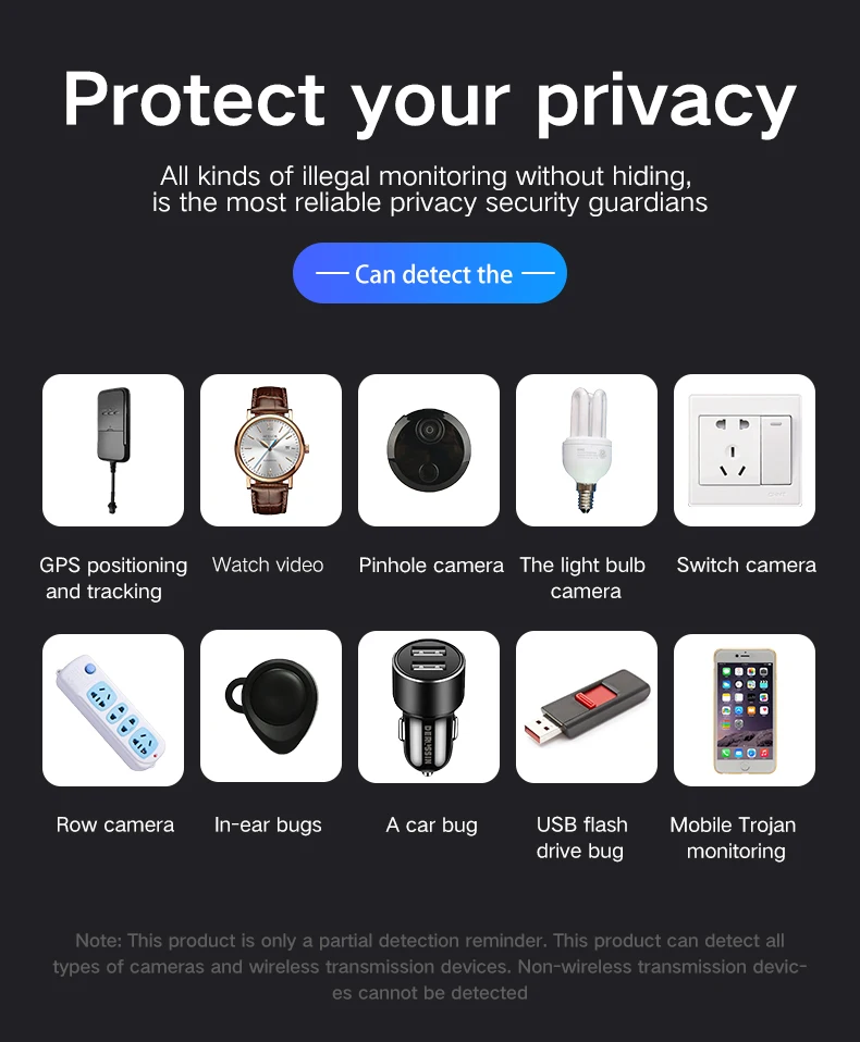 Оснащенный военной детективной мощью, лазерное обнаружение может автоматически обнаруживать все камеры, включая камеры для сна и неинфракрасные камеры, которые не могут быть обнаружены обычными tectors.