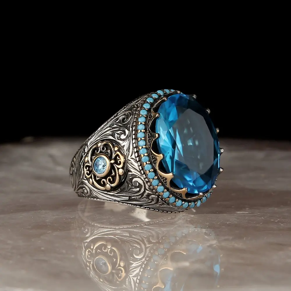 Бесплатная доставка МУЖСКОЕ кольцо из стерлингового серебра 925 пробы с голубым топазом, ручная работа, мужские подарочные украшения, высокое качество, сделанное в Турции, модный дизайн из натурального камня