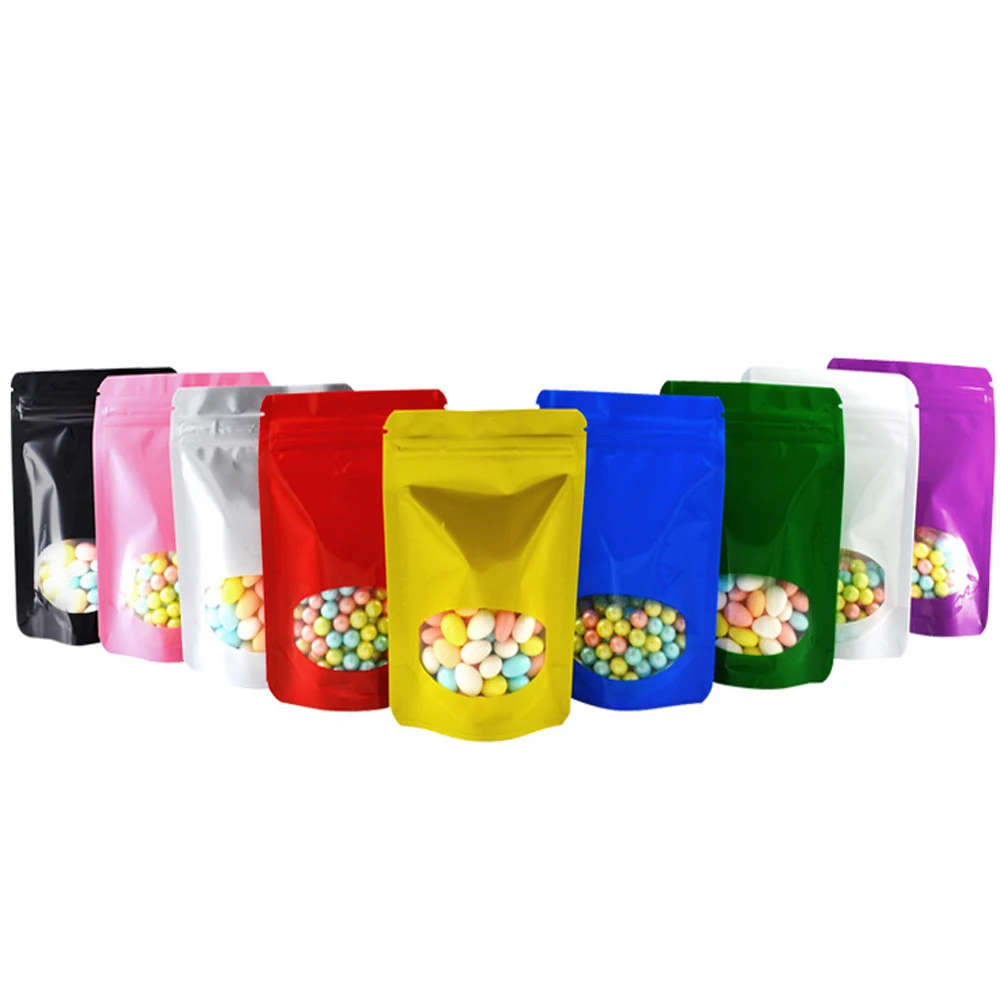 100 шт. Глянцевая алюминиевая фольга с прозрачным окном, стоячий пакет, еда, конфеты, кофе, чай, сушеные фрукты, закуски, многоразовый закрываемый замок на молнии