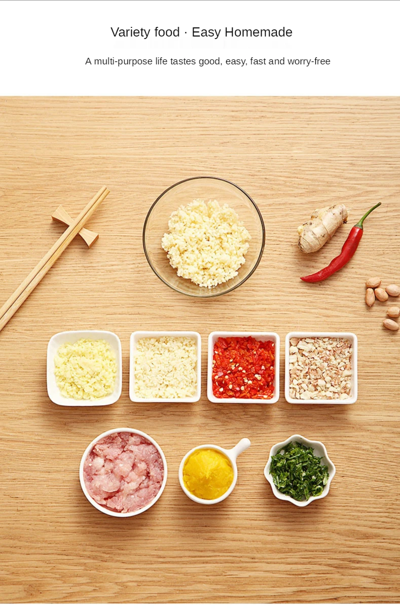 Высококачественный безопасный материал-СделаноИз высококачественного безопасного материала, основной корпус изготовлен из пищевого АБС-пластикаИ полипропиленовый материал, безопасный и безвредный. Он был оснащен 340Лезвия из нержавеющей стали, которые делают более быструю уборку, мясорубку иШлифовка чем нож. Это идеальный кухонный инструмент для измельчения чеснока,Измельченный свежий чили и т. Д.
