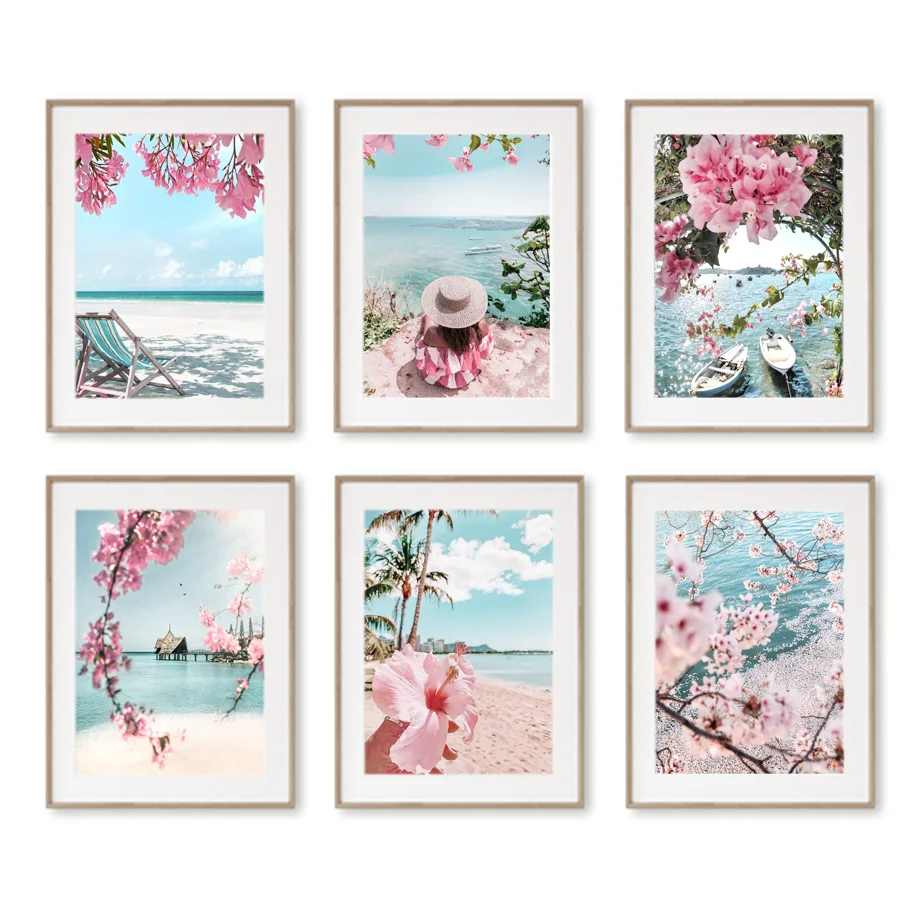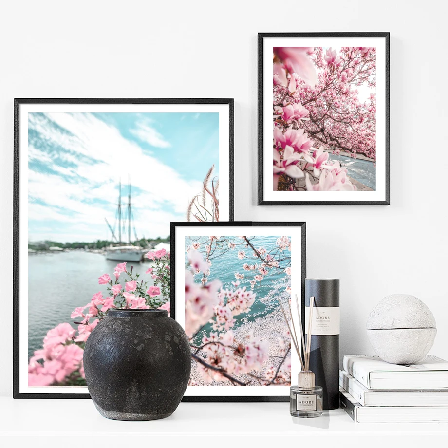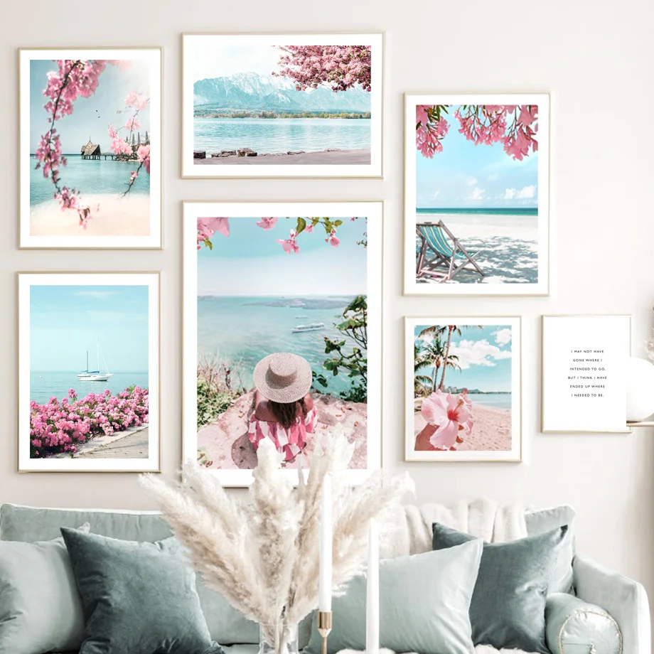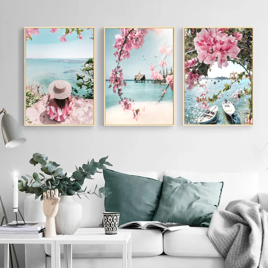 Морской пляж девушка утро Цветок Порт лодка нордическая стена искусство холст живопись плакаты принты картинки для декора гостиной