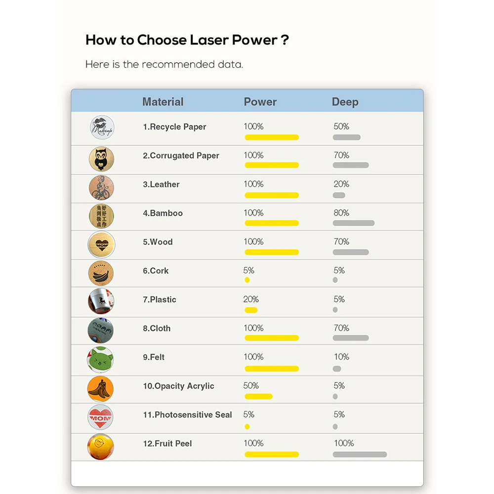 6. Материалы, которые могут быть выгравированы: дерево, бамбук, бумага, пластик, кожа, резина, губка, расческа, кошелек или другой горючий пластик (например, мобильный телефон чехол, мышь, карандаш, визитная карточка, бумажник, пластиковая расческа); : металл, камень, ювелирные изделия, отражающие материалы, серебро, Белая бумага (астигматизм, плохой эффект), материалы, которые не могут быть сгорели или сфокусированы, такие как металл без какого-либо покрытия, светильник-трансмиссионный пластик, с дополнительным огнезащитным материалом