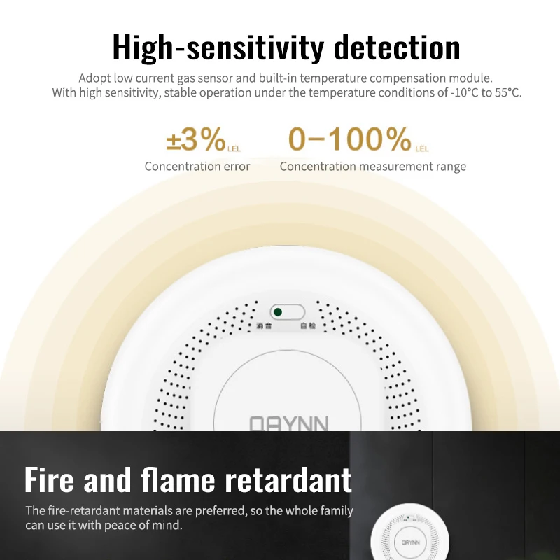 【Обнаружение высокой чувствительности】Использование низко-токовых газовых датчиков, встроенный модуль компенсации температуры, с высокой чувствительностью, точной сигнализацией, для предотвращения пожаров.