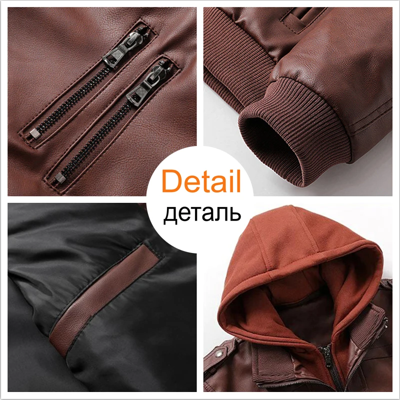 Куртка-бомбер мужская из ПУ кожи, со съемным капюшоном, на осеньзиму