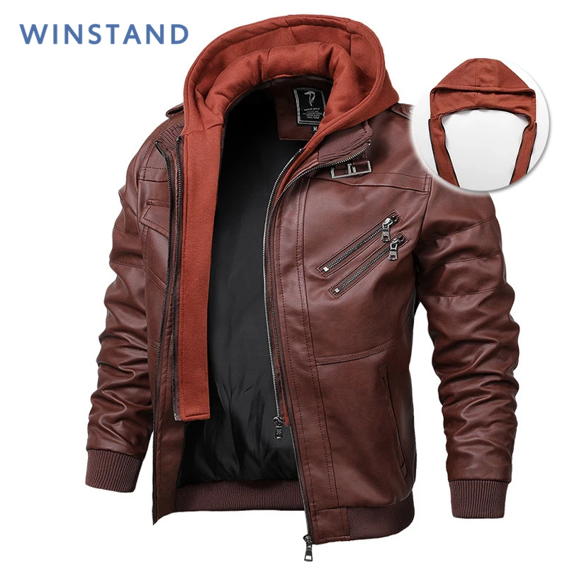 Мужская кожаная куртка с капюшоном, однотонная теплая байкерская ку...