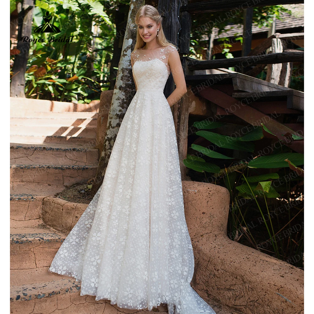 Классическое Свадебное платье с глубоким вырезом 2022 Цветочные кружевные белые свадебные платья в стиле бохо со шлейфом коротким рукавом трапециевидные свадебные платья