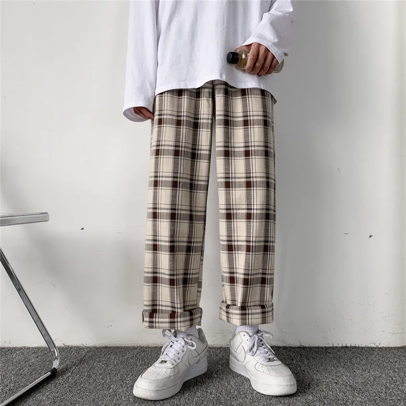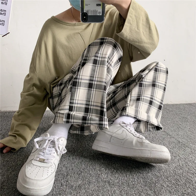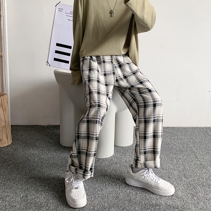Штаны HOUZHOU мужские клетчатые, повседневные клетчатые брюки в Кор...