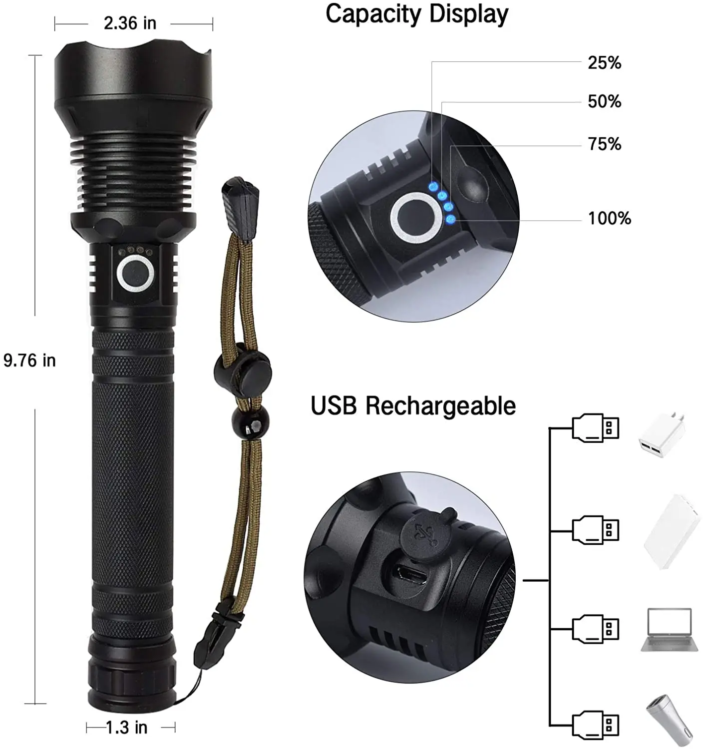 【Usb-зарядка и напоминание об аккумулятореЭтот перезаряжаемый фонарик оснащен 2 [26650] батареями, которая используется для длительного заряда. Оснащен зарядным устройством USB, когда светодиодный фонарик необходимо зарядить, вы можете заряжать через встроенный порт USB для зарядки. На ручка фонарика есть 4 синих индикатора. Вы можете легко определить оставшуюся Мощность Портативного фонарика через световой индикатор и зарядить его вовремя.