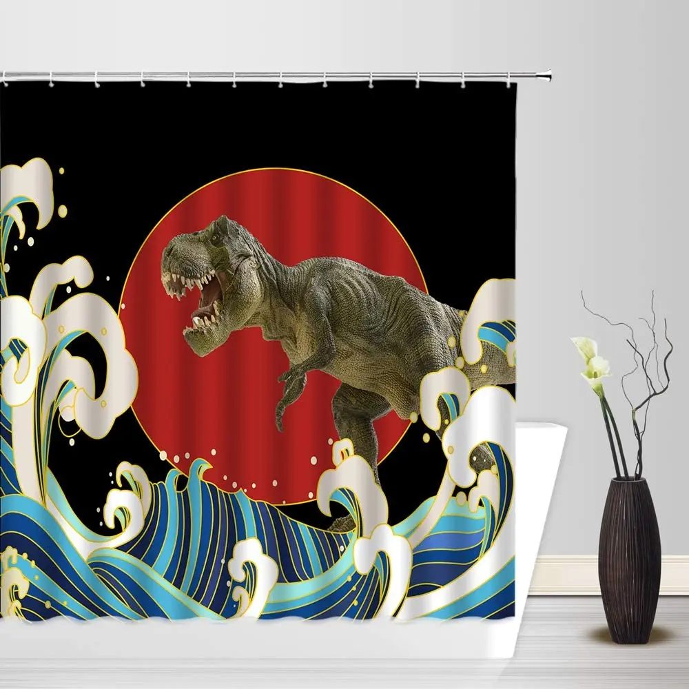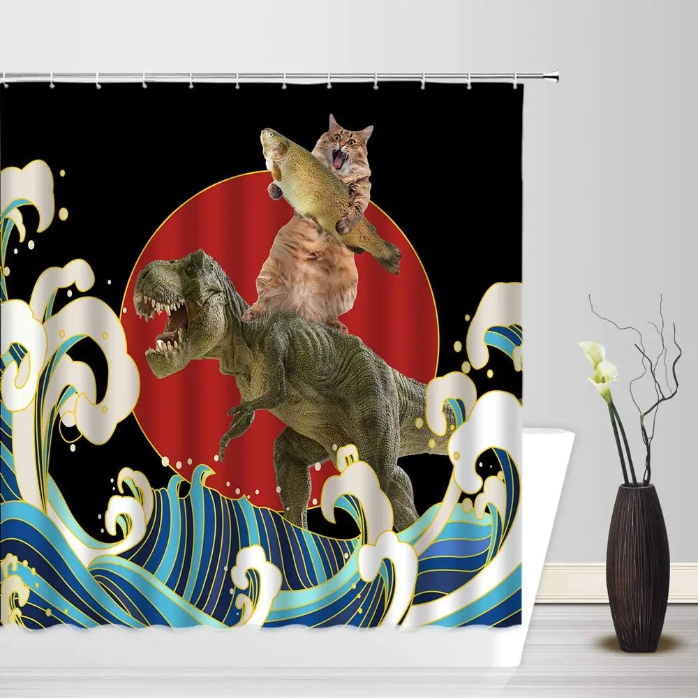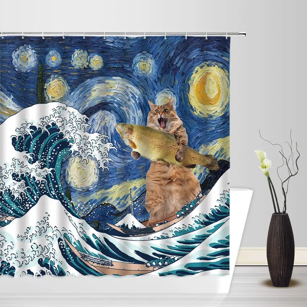 Забавная занавеска для душа в виде кошки, японские волны, абстрактная кошка, удерживающая рыбу, картина маслом, художественный тканевый Декор для ванной комнаты, наборы с крючками, синий