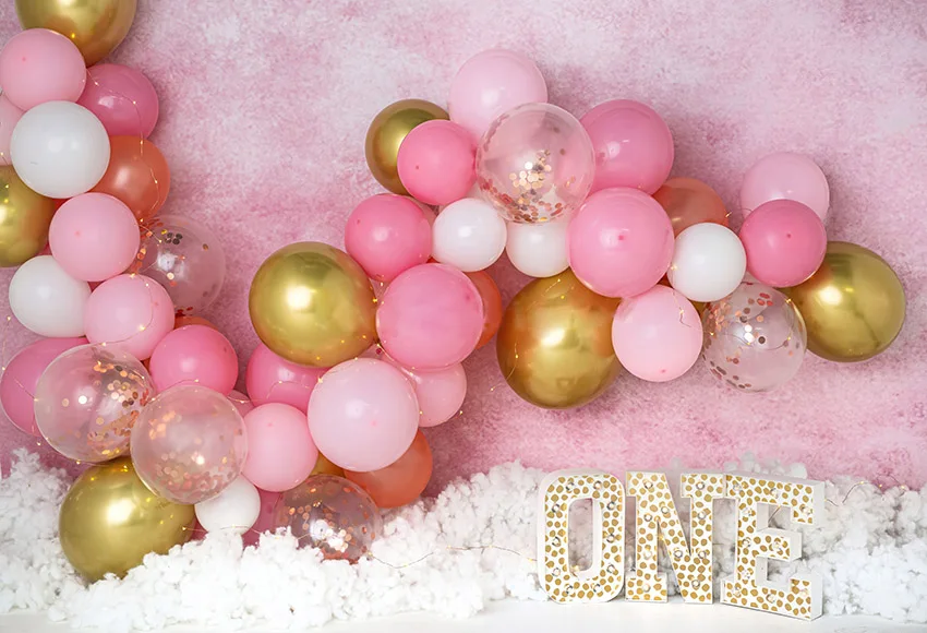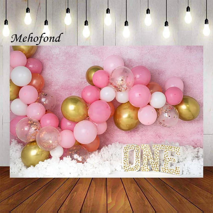 Фон для фотографий Mehofond розовый воздушный шар белый облако принцесса девушка 1-й день рождения торт разбивать Фотостудия