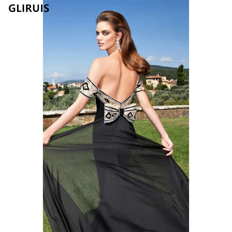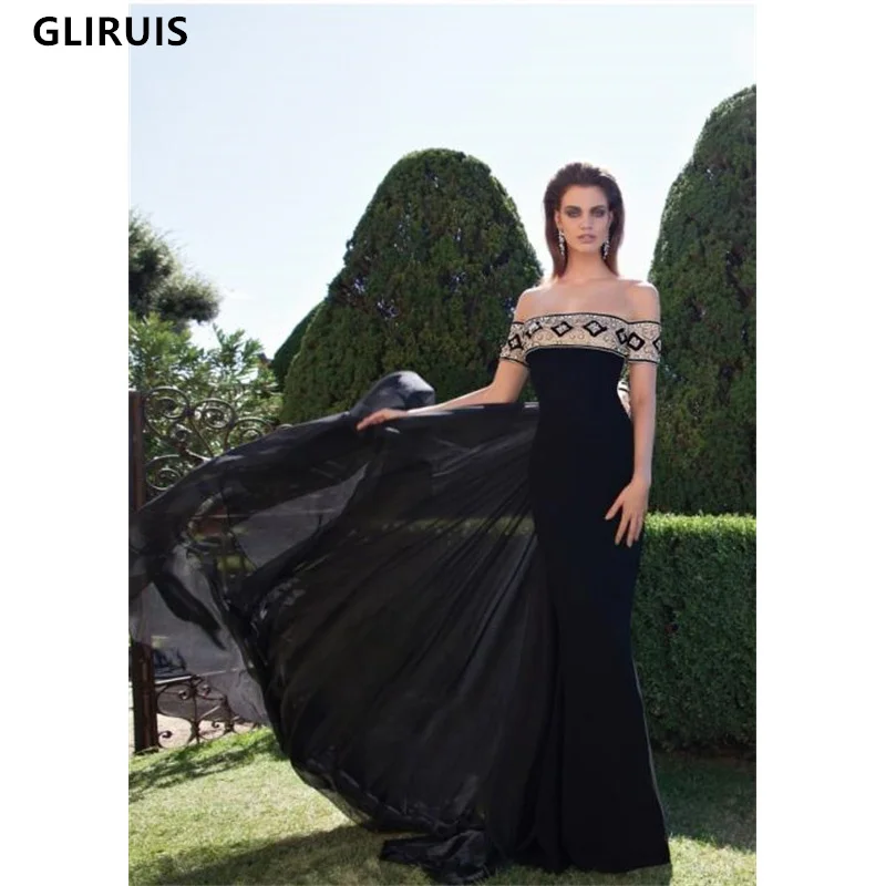 Черное вечернее платье с юбкой-годе со съемным шлейфом и открытыми плечами