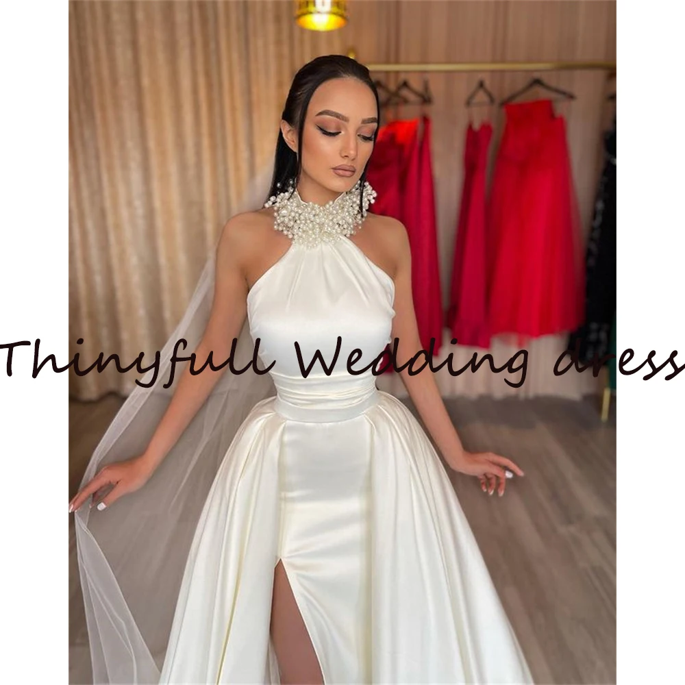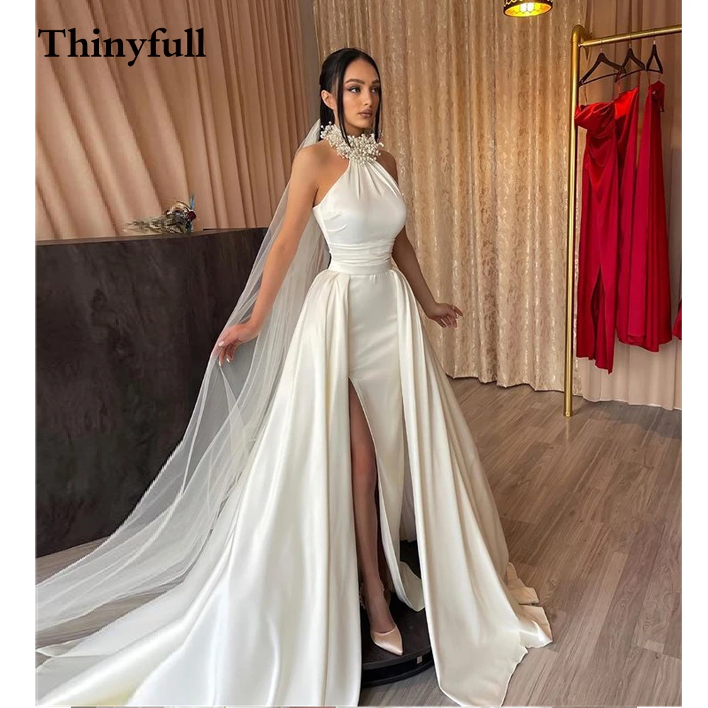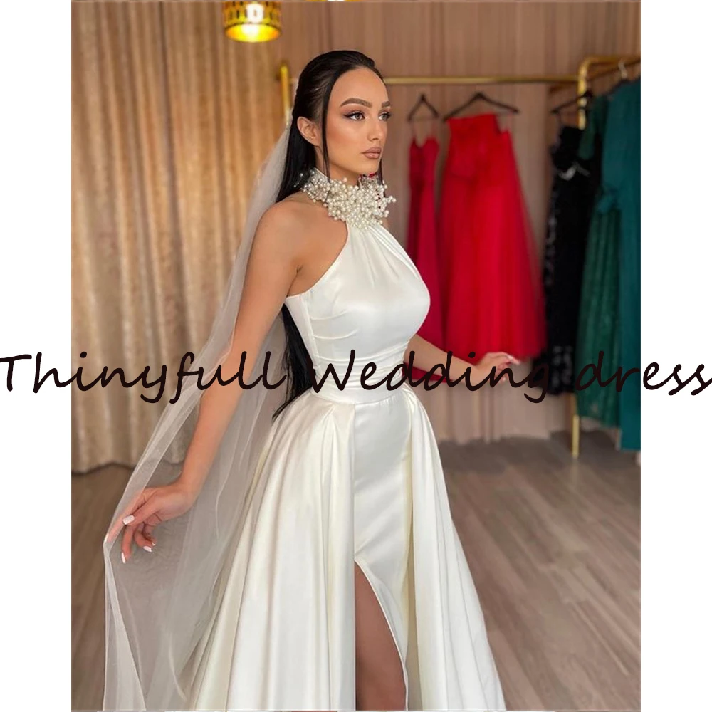 Женское длинное свадебное платье Thinyfull, мягкое платье трапециевидной формы с высоким воротником, без рукавов, с жемчужинами и Боковым Разрезом, платье невесты в сельском стиле