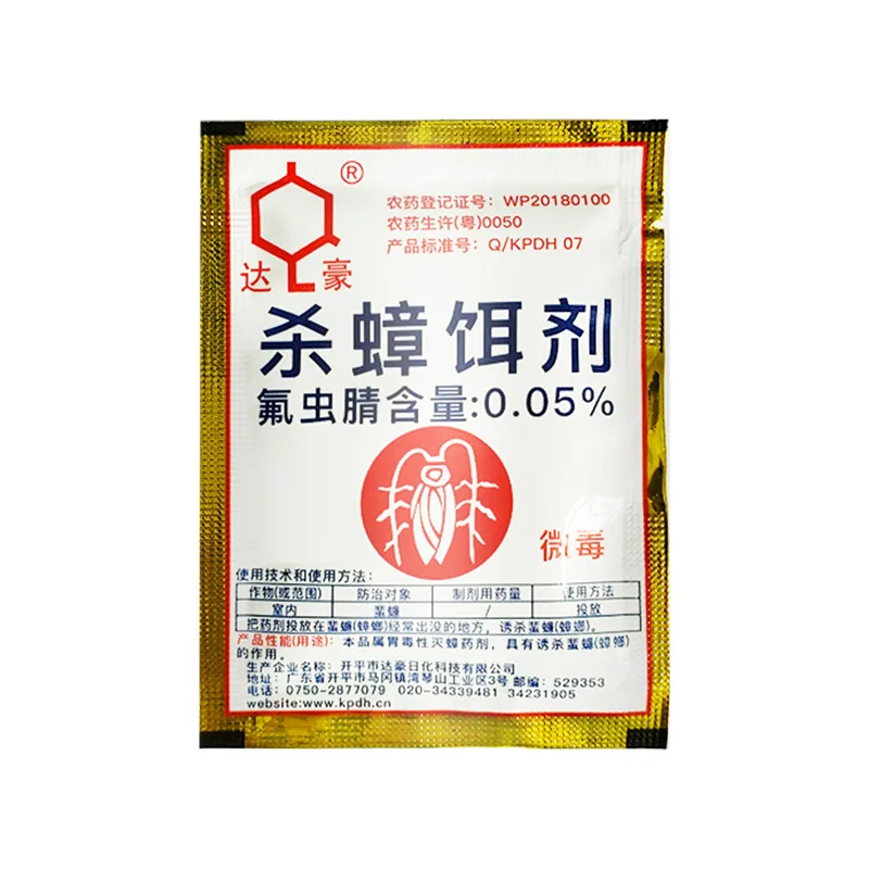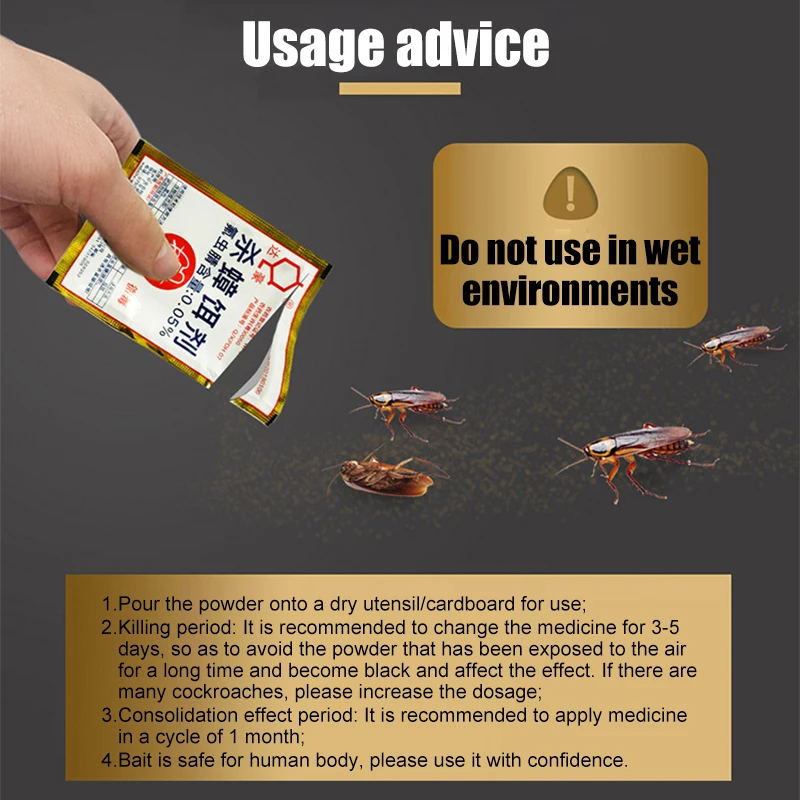1. Инструкции по использованию:Приманка для уничтожения тараканов подходит для тараканов/немецких тараканов на заводах и шахтах, семейных домах/пасторальных \ фруктовых лесах. Это санитарный инсектицид для домашних и общественных мест.2. Как использовать:Оторвите посылка и налейте приманку прямо в место, где тараканы частые или в корыто). Количество кормления в основных областях вредителей (таких как кухни, туалеты, водостоки) составляет 4 г/м2. Дозировка на светильник-вредителей-2 г/м². Немецкий таракан начал гибнуть на следующий день после еды приманки.3. Этот продукт чрезвычайно привлекателен для немецких тараканов. Эта приманка является уникальной формулой, которая может серийно убить и сделать популяцию тараканов вымершей. Эффект долговечен и не вызывает лекарственной устойчивости. Низкая токсичность, безопасность, гигиеничность и отсутствие загрязнения для людей и животных4. Хранение и транспортировка:Храните продукт в прохладном, проветриваемом и сухом месте для предотвращения сильного давления, ожесточенных щитов и дождя. Он не должен храниться и транспортироваться вместе с продуктами питания, сырьем, зерном, семенами, легковоспламеняющимися и взрывоопасными продуктами.