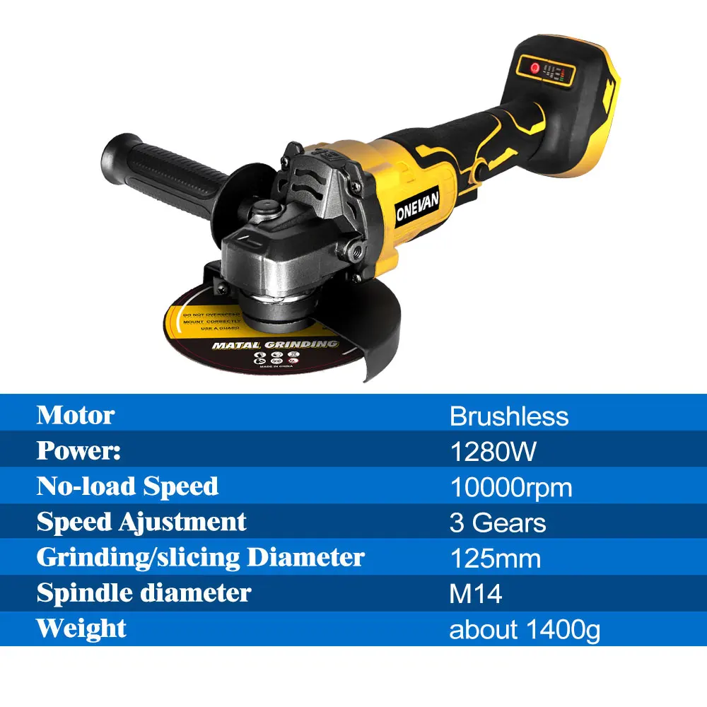 Тип двигателя: бесщеточный двигательНапряжение: 18 вМощность: 1280 ВтСкорость: 10000 об/минРегулируемая шестерня: 3 шестерниБатарея Модель: подходит для Makita 18v БатареяРазмер: 125 ммРазмер пресс-пластины: M14Маленький и Новый светильник