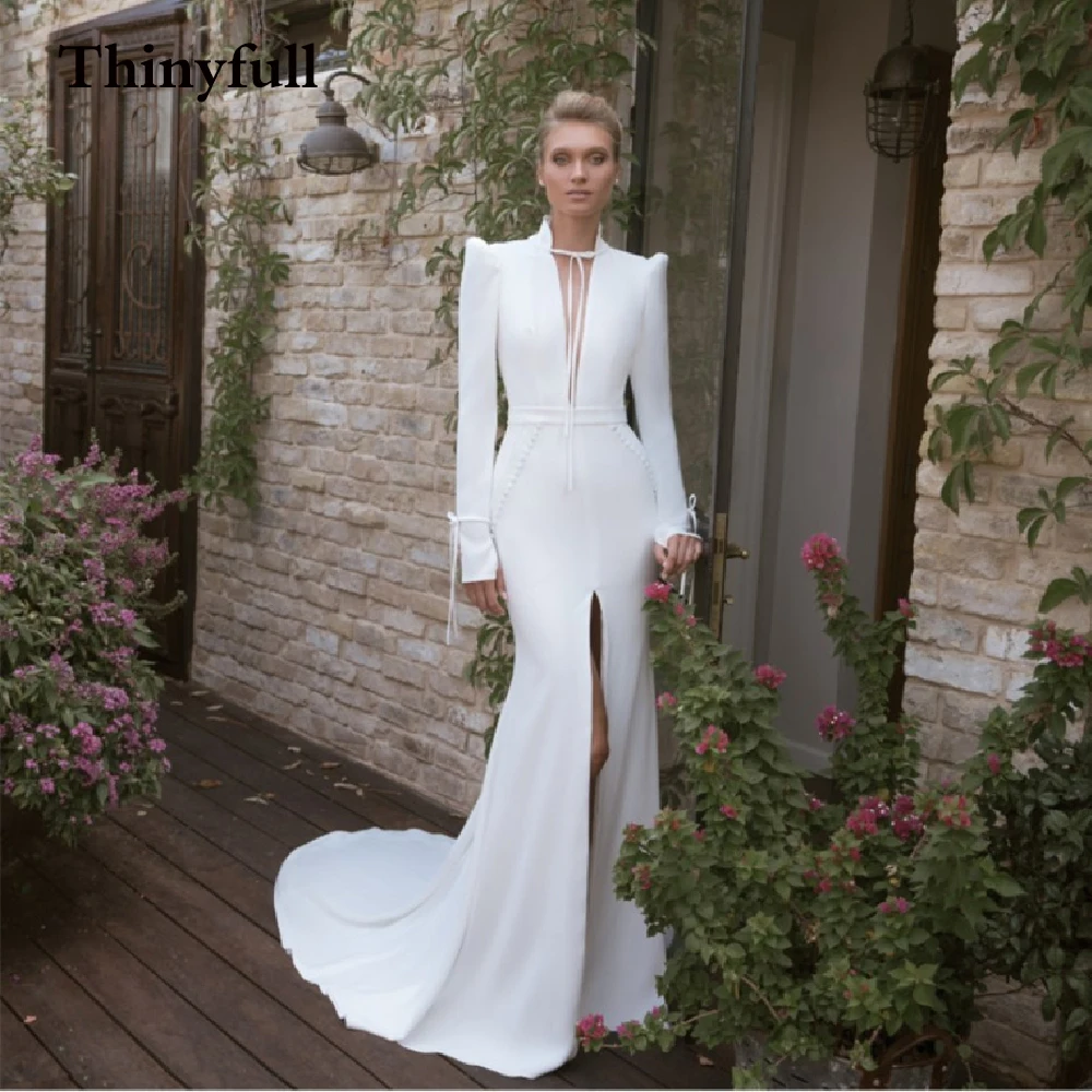 Женское длинное свадебное платье с юбкой годе, элегантное мягкое платье с V-образным вырезом, длинными рукавами, пуговицами и Боковым Разрезом, платье невесты и принцессы для свадьбы