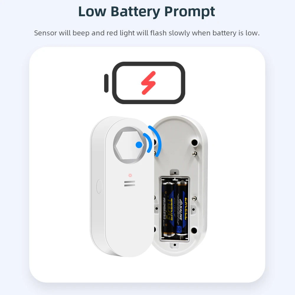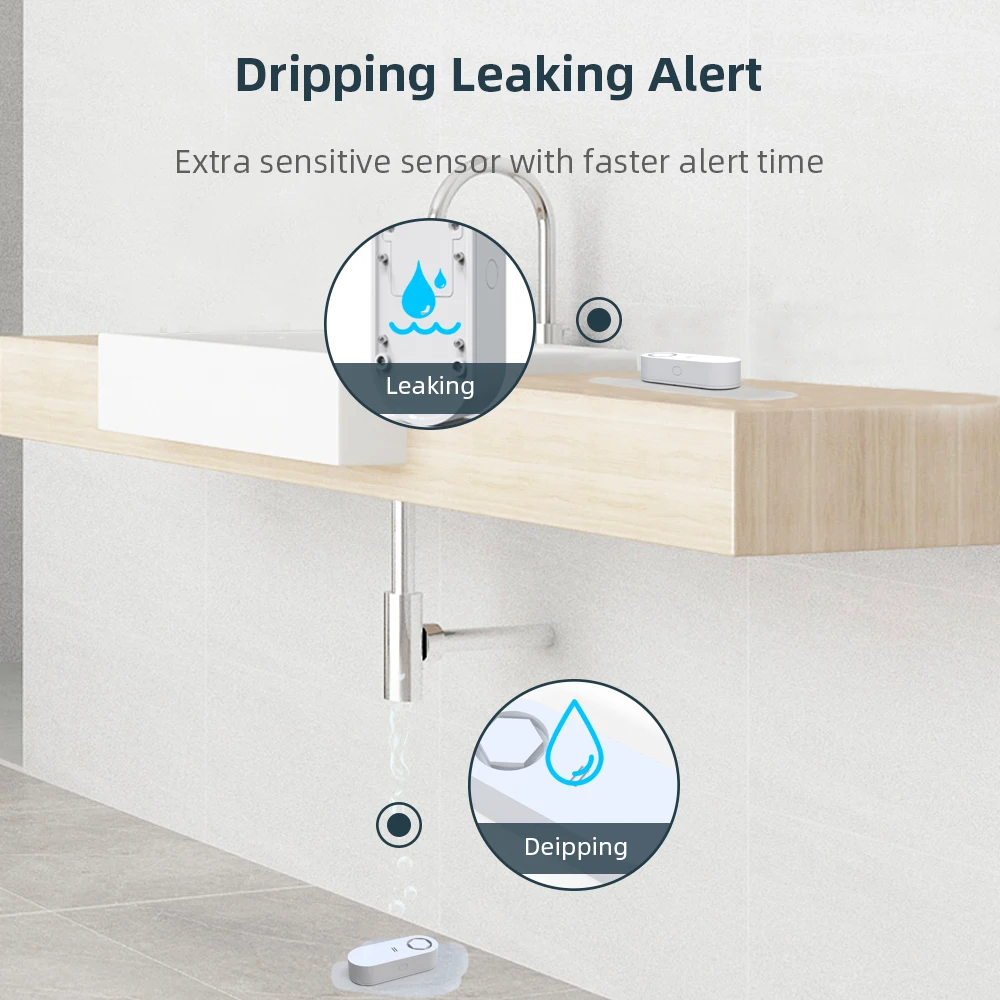 -100% без проволоки, легко установить-Подключение Wi-Fi 2,4G, не требуется концентратор-Когда датчик обнаруживает утечку воды, он издаст сигнал тревоги, и приложение будет нажимать уведомления-Встроенный аккумулятор 2X AAA с функцией оповещения о низком заряде батареи-Установите варианты в приложении, например, когда датчик воды Обнаруживает утечку воды, используйте Умный клапан для выключения воды-Скачать бесплатное приложение «TuyaSmart» или «Smart Life» на iOS и Android