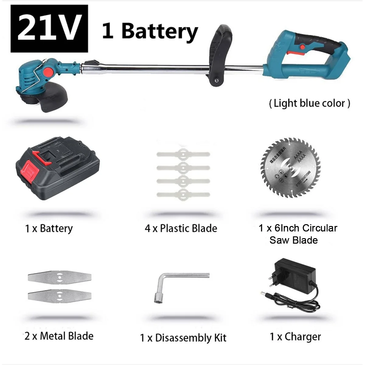 Батарея: 0/1/2 шт 1500 мА/ч, БатареяЦвет: синийНоминальная мощность: 900 ВтНапряжение: 21 вСкорость: 0-12000 об/минМожет растягиваться: 99-135 см3 типа лезвийПластиковое лезвие: подходит для обрезки газоновМеталлическое лезвие: подходит для обрезки сорняковЛегированная пила: подходит для обрезки культур, кустарников и т. д.