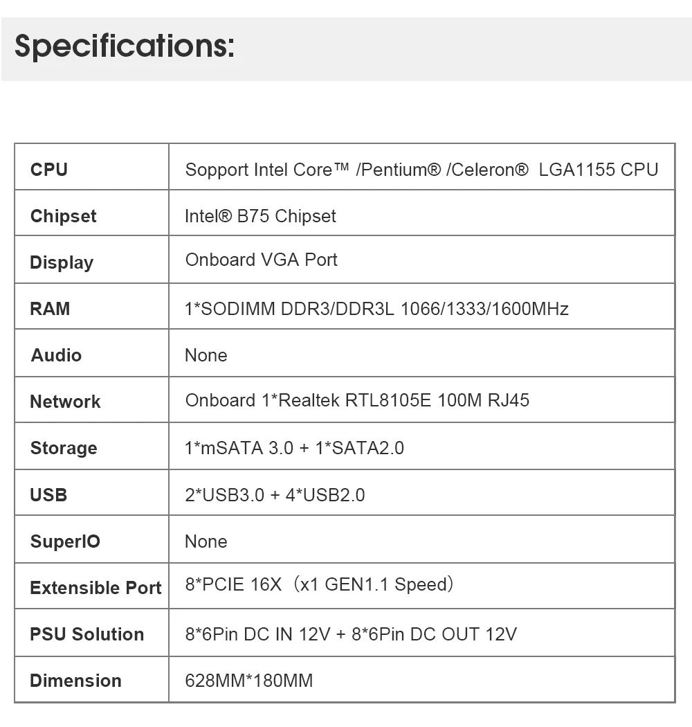 Состояние: полная НовинкаФорм-фактор: 628 мм x 180 мм.Поддержка ЦП:Процессоры серии Intel Core/Pentium /Celeron LGA1155.GPU слоты: 8 * PCIE x16Тип памяти: DDR3 SO-DIMM.Интерфейс хранения: 1 * mSATA 3,0 + 1 * SATA2.0.Порты USB: 2 * USB3.0 + 4 * USB2.0.LAN: Встроенный 1 * Realtek RTL8105E 100M Ethernet.Интерфейс дисплея: 1 * VGA.Поддержка системы:Windows 10, linux, HiveOS, RaveOS и т. Д..