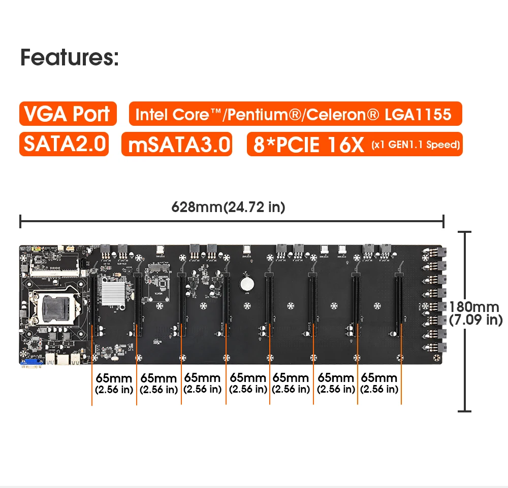 Поддержка процессоров серии Intel Core/Pentium /Celeron LGA1155.65 мм (2,56 дюйма) очень большое расстояние между слотами для графических карт, поддержка одновременной вставки 8 видеокарт большого размера.