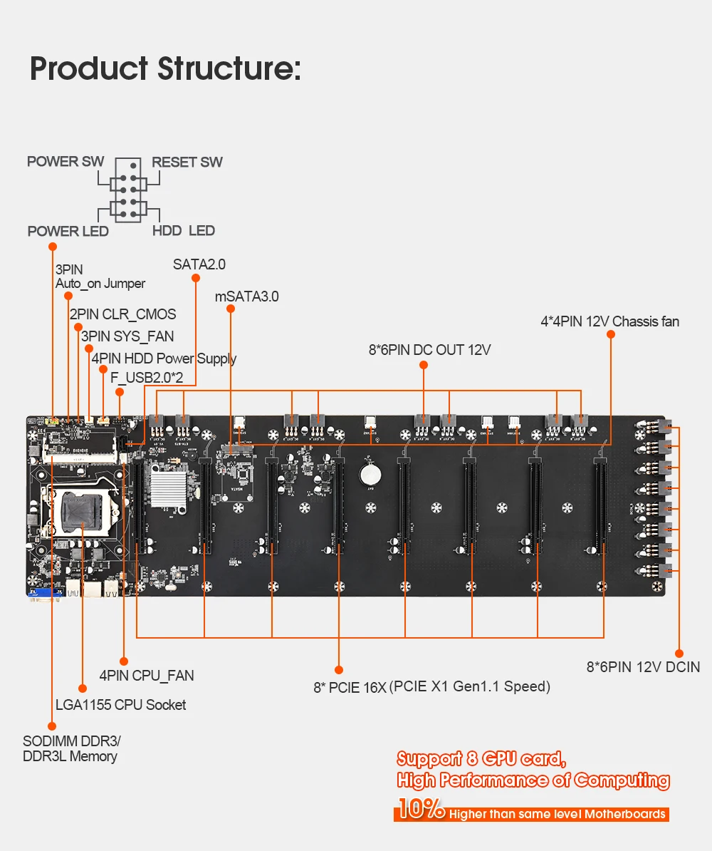 FQAВопрос: какие криптовалюты могут быть у этой материнской платы?A: эфириум ETH / Ravencoin(RVN) /ШибаВ: какие графические карты можно использовать на этой материнской плате?О: кроме карт серии RTX3060, все другие основные графические карты майнинга могут быть использованы на этой материнской плате, такие как RX580 / RX5500 XT / RX5700 / GTX1660 SUPER / GTX1660 Ti / RTX 2060 2070 3070 3080 3090, И т. д.В: каков хашрат видеокарты на этой материнской плате?О: за исключением карт серии RTX3060, все другие графические карты для майнинга могут выпустить обычный hashrate на этой материнской плате.В: какие операционные системы поддерживает материнская плата?Ответ: поддерживаются основные операционные системы, такие как windows 10, linux, HiveOS, RaveOS и т. д.В: каков интервал между слотами PCIe?О: расстояние между слотами PCIe ETH-B75 составляет 65 мм (2,56 дюйма), большое расстояние может соответствовать прямой вставке 8 видеокарт большого размера без необходимости передачи переходника.В: какой источник питания используется эта материнская плата?О: ETH-B75 может использовать источник питания ATX и DC. При использовании источника питания ATX необходимо использовать адаптер для короткого замыкания 24-контактной вилки источника питания.Вопрос: Есть ли аккумулятор на этой материнской плате? Какой тип батареи используется?О: материнская плата не имеет батареи, потому что таможня запрещает батарею. Модель батареи CR2032.В: Как получить видео выход, есть ли Встроенная видеокарта?О: материнская плата имеет встроенный процессор и встроенную графическую карту.