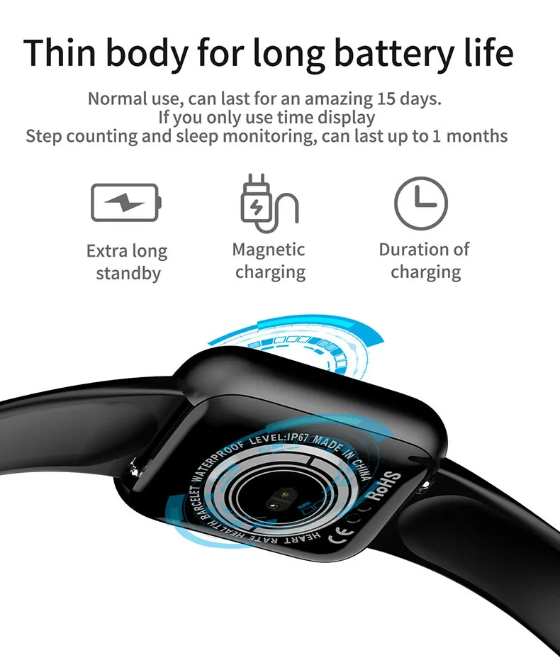 Примечание: 1. После загрузки приложения, пожалуйста, не забудьте установить правильную информацию о пользователе в приложении (возраст, пол, рост, вес), при измерении, страница измерения на браслете, если он уйдет. Пожалуйста, измените цвет кожи в приложении 2. Когда вы открываете приложение на своем телефоне, вам нужно прокрутить вниз по экрану, чтобы увидеть все опции меню. 3. После подключения, вы можете нажать mine, чтобы заполнить вашу персональную информацию и нажать управление или управление устройством, чтобы установить, какую функцию вы хотите 4. После подключения, время и дата часов будут синхронизироваться с вашим смартфоном Описание товара: Основной материал: Чехол: сплав + пластик; Ремешок: силикагель Форма циферблата: прямоугольник Размер ремешка: 260 мм * 20 мм * 2,3 мм Размер корпуса: 41*34*10 мм Основной дисплей: 1,3" Емкость аккумулятора: 170 мАч Время работы в режиме ожидания: 10 дней Нормальное время использования: 3-5 дней Время зарядки: около 2 часов Тип оповещения: вибрация ЦП: Hs6620D Частота сердечных сокращений: SC7R30 Основная функция: * Монитор сердечного ритма * Монитор артериального давления * Монитор кислорода в крови * Шаг * Расстояние * Калории * Спортивный режим * Монитор сна * Отображение времени * Секундомер * Идентификатор вызывающего абонента (необходимо установить на приложение и мобильный телефон) * SMS напоминание (необходимо установить на приложение и мобильный телефон) * Напоминание о приложении (whatsapp,Twitter,line,Facebook) (необходимо установить на приложение и мобильный телефон) * Напоминание о малоподвижности * дистанционный спуск затвора камеры * Напоминание о будильнике * Поднимите руку, чтобы осветить экран * Не беспокоить режим * Беговая дорожка * Погода * Яркость экрана регулируется * Найти браслет * Переключатель циферблата * Здоровье яблока * Еженедельник здоровья * Обновление OTA * Водонепроницаемость IP67