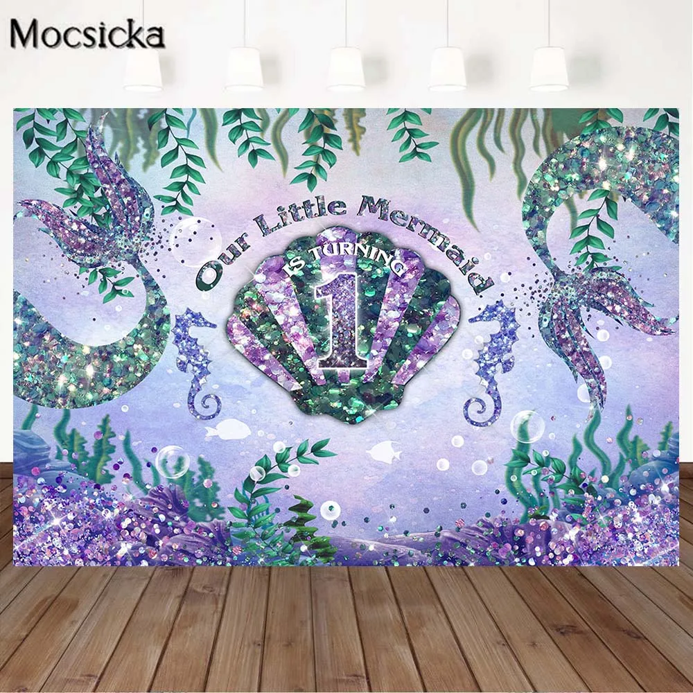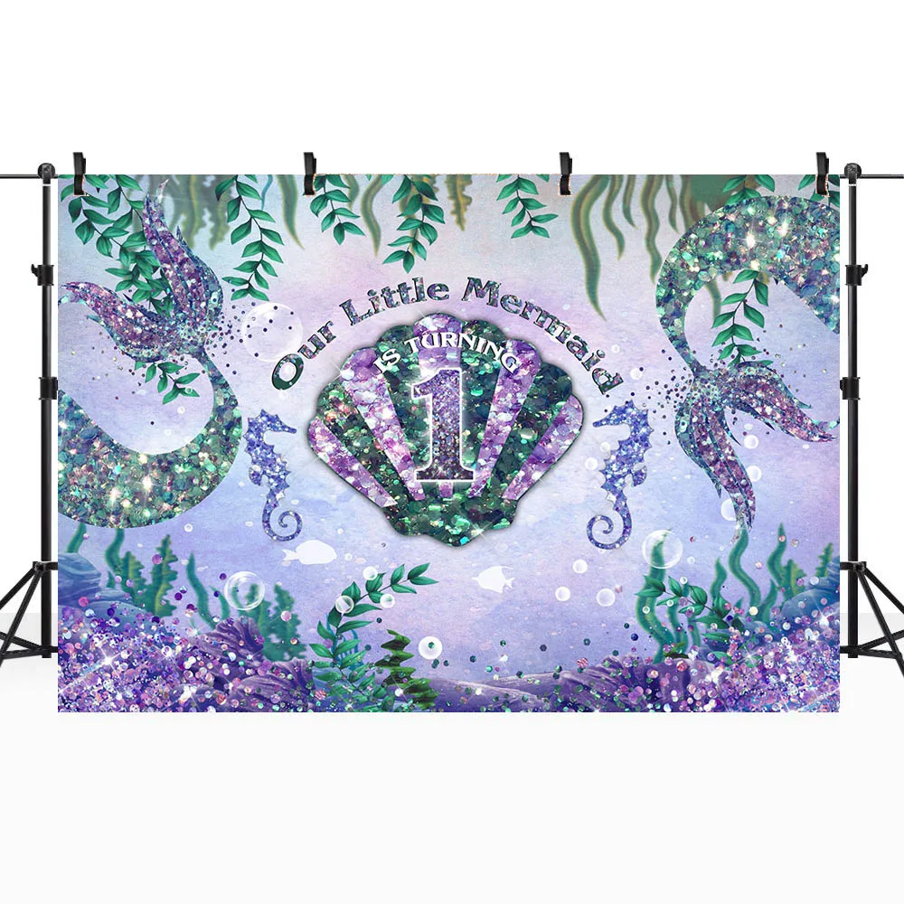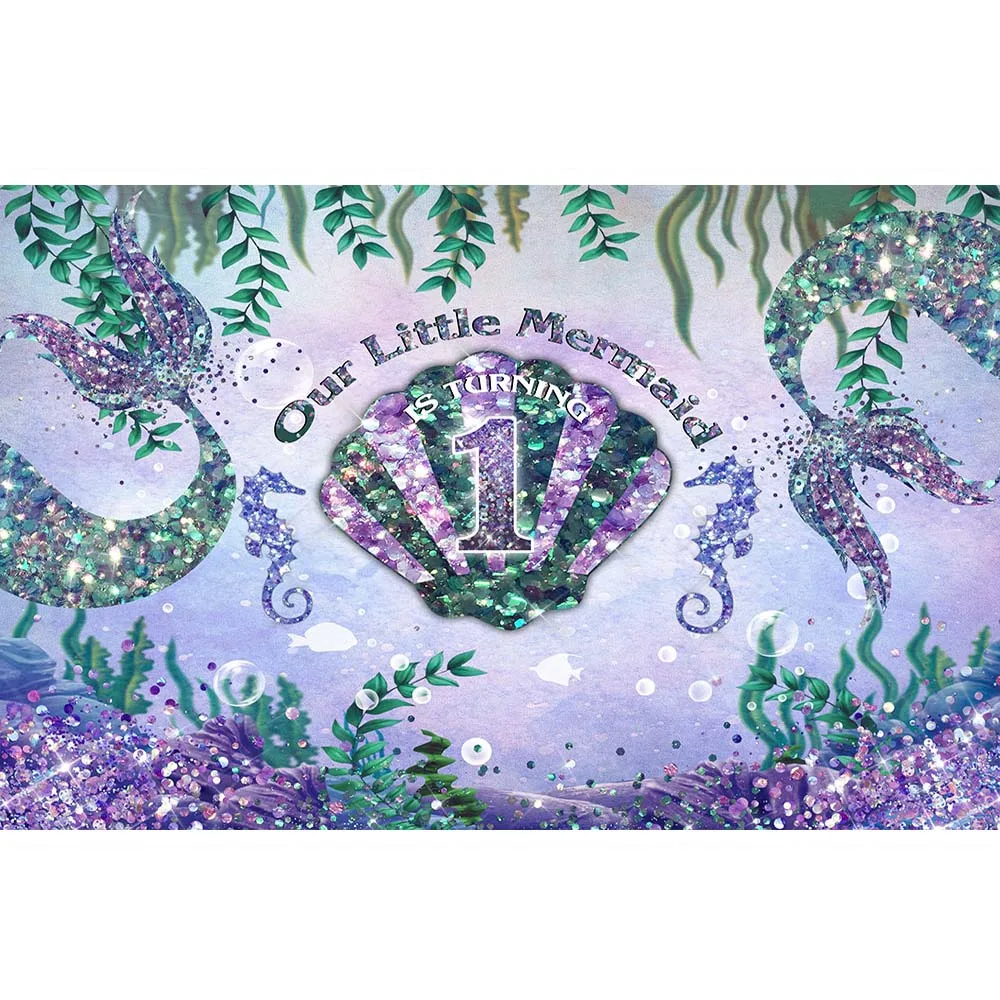 Mocsicka Русалка день рождения фото фон наша маленькая Русалка поворачивается 1 зеленая фиолетовая ракушка фотография декорации баннер