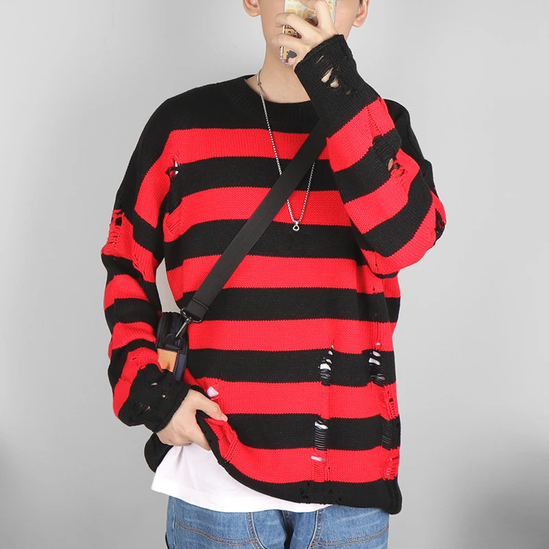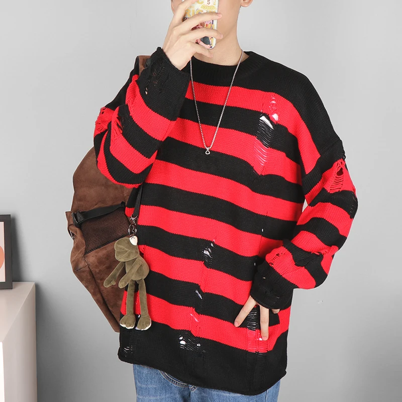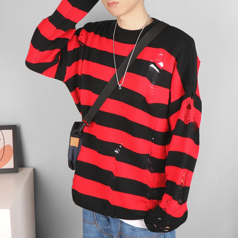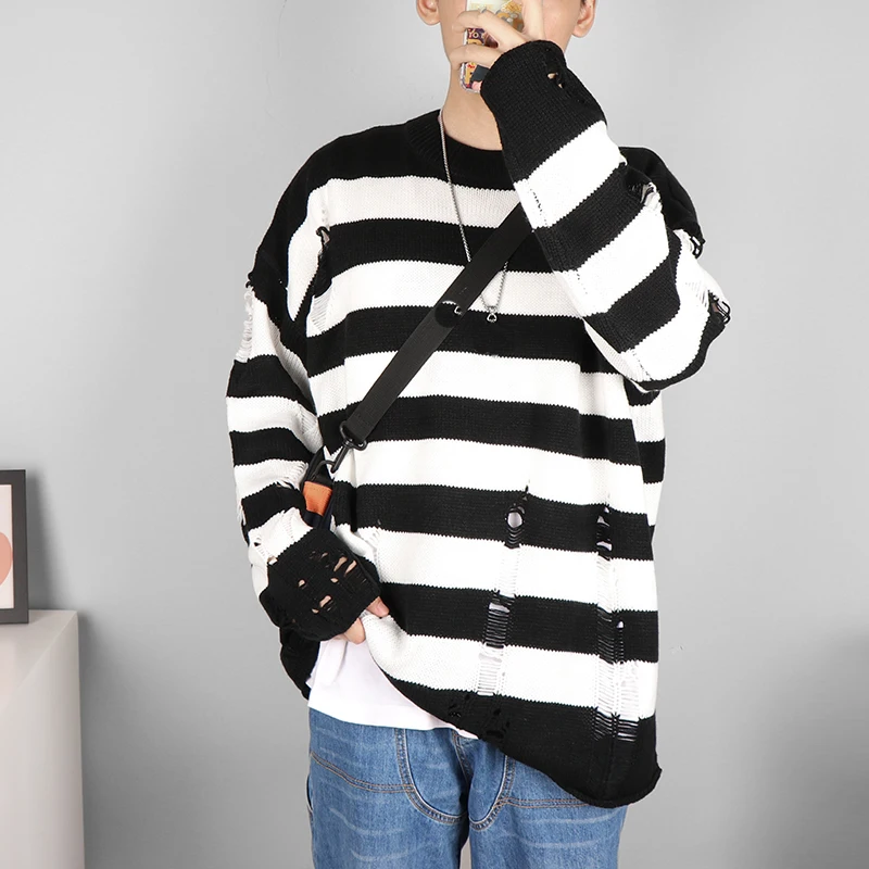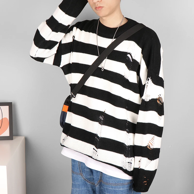 Мужские свитера в черную полоску, рваные свитера, пуловер с дырками...