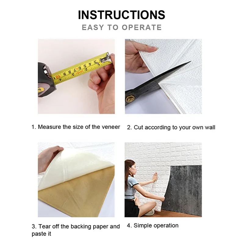 Особенности:** Самоклеющиеся и съемные: Снимите клейкую подложку и приклейте к любой сухой плоской поверхности. Никакого дополнительного клея или инструмента не требуется.** Легкое удаление: легко удаляется без повреждения поверхности, без остатков.** Мягкие поролоновые обои: это анти-столкновение, Мягкая Пена уменьшает шум, безопасность и защиту окружающей среды** Материал хорошего качества: изготовлен из высококачественной пены XPE, нетоксичный, без запаха, мягкий и гибкий.** 3D кирпичные обои: текстурированные 3D кирпичные обои являются хорошим украшением для вашей стены.** Легко чистить: можно чистить и обслуживать влажной тканью, это удобно для ежедневного использования.** DIY: легко резать и обрезать в соответствии с вашими различными потребностями установки.** Применимые поверхности: подходят для гладкой, чистой, жаркой и плоских поверхностей, таких как пластик, стекло, дерево и многое другое.** Многофункциональность: кирпичные обои можно безопасно установить в любую комнату, например, в гостиную, спальню, детские комнаты, кухонные стены, офис и т. д., чтобы создать индивидуальный внешний вид.**Простота установки:1. Измерьте стену, чтобы получить подробные размеры перед резкой.2. Сначала очистите пыль.3. Обрежьте подходящий размер в соответствии с декоративной областью.4. Очистите заднюю бумажную наклейку, затем Наклейте на плоскую поверхность.5. Нажмите на панель, чтобы убедиться, что она правильно прилипает к стене.