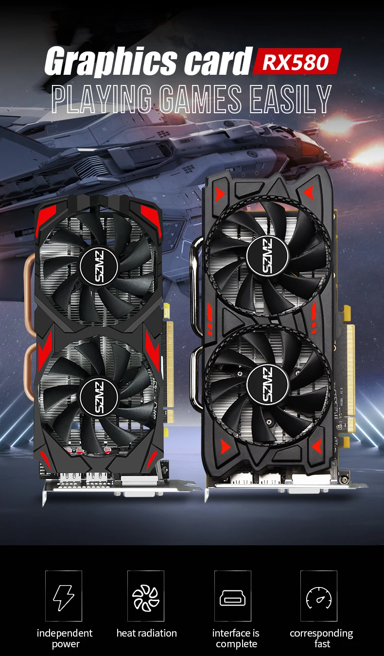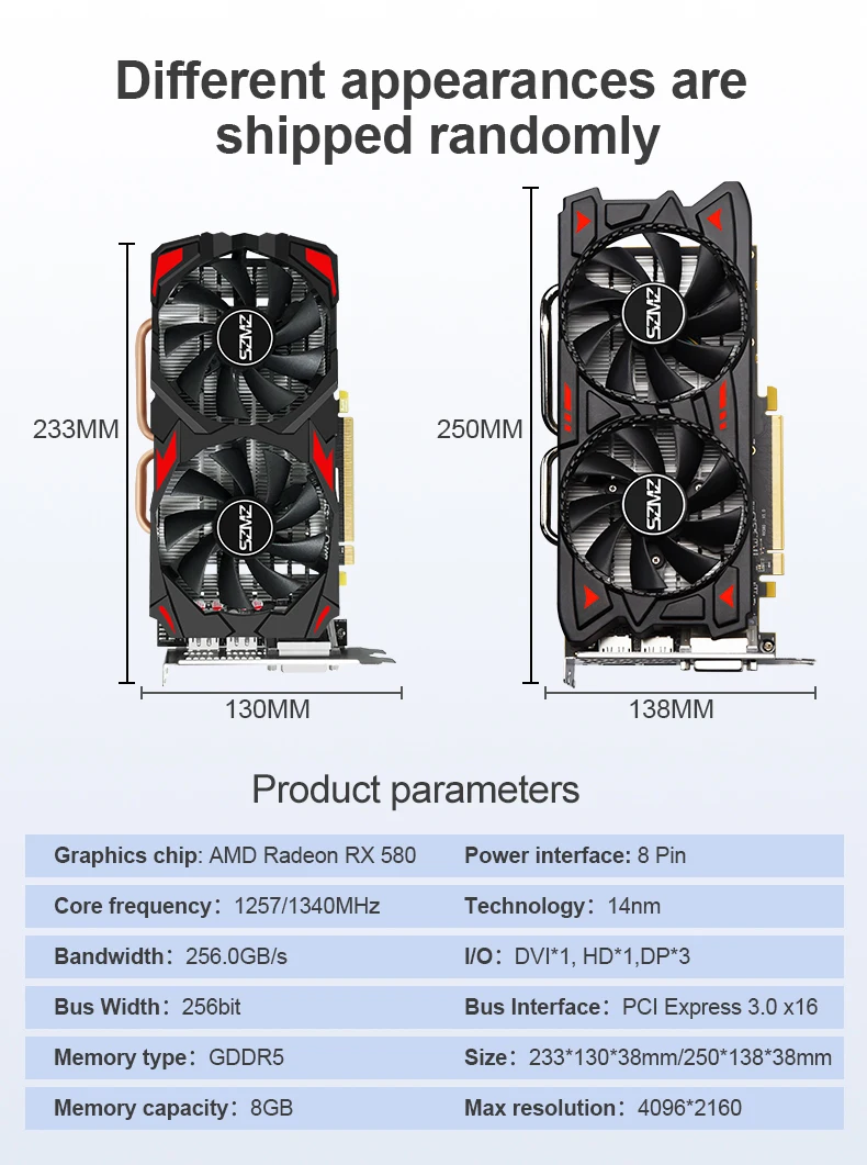 • 100% оригинальный чипсет AMD Radeon (RX580/570/574/470/474 отправляется случайным образом)• 100% натуральная 8 ГБ GDDR5 256 бит