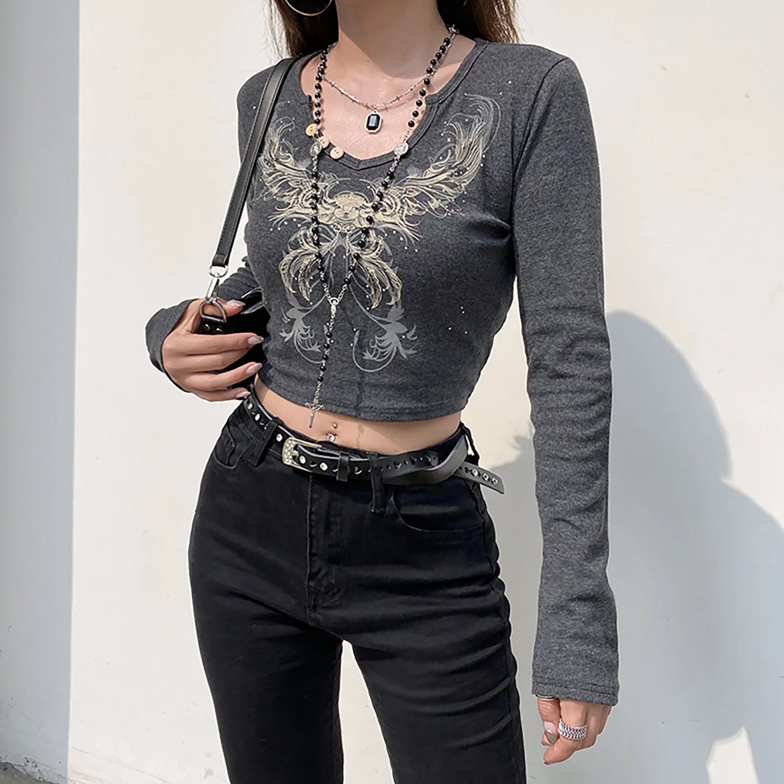 Топы с принтом крыльев Ангела, волшебные гранж-футболки с графическим рисунком, винтажная Эстетическая одежда инди, тонкий Топ с длинным рукавом Y2k