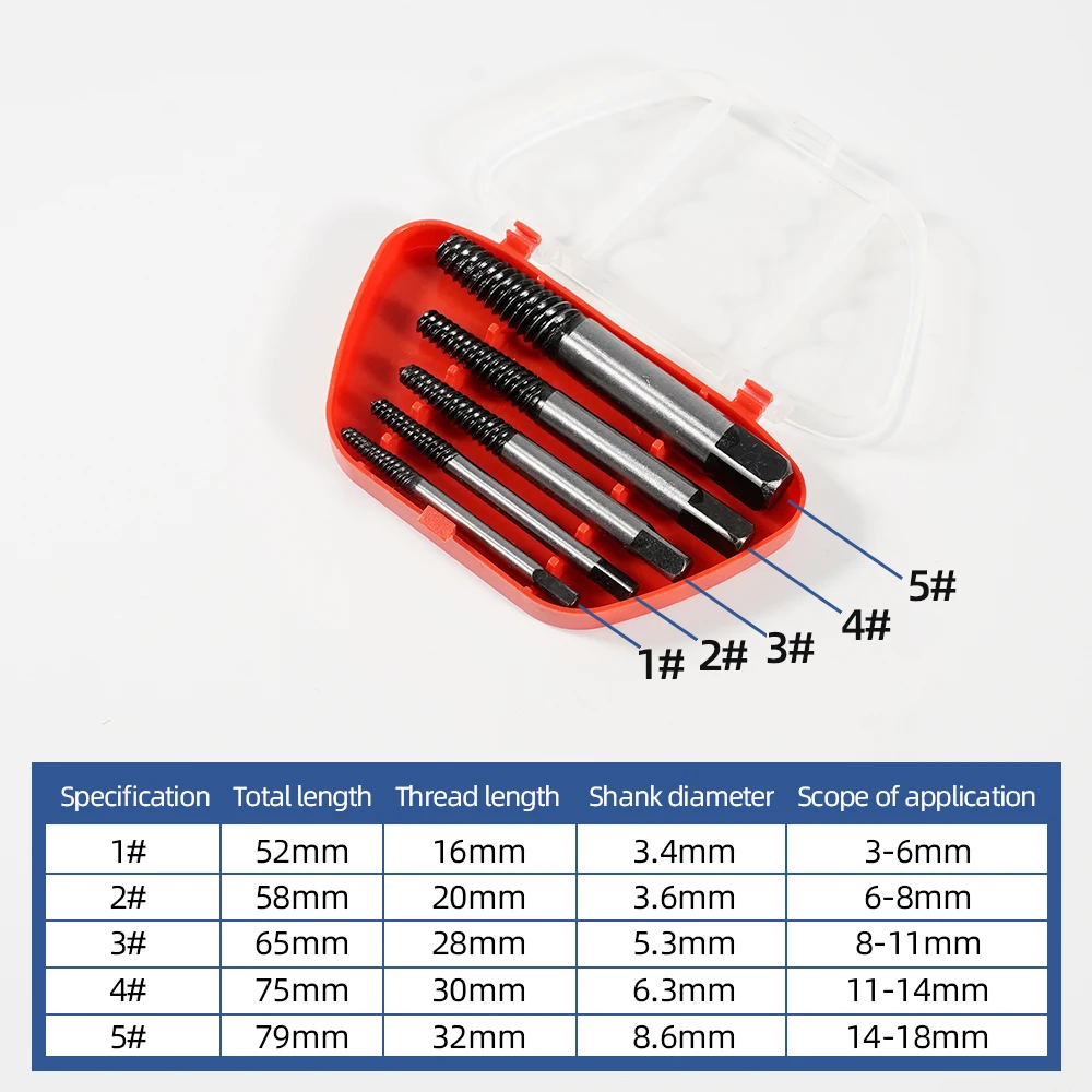 5 шт. винтовых экстракторов (упаковка коробки):1 # + 2 # + 3 # + 4 # + 5 #