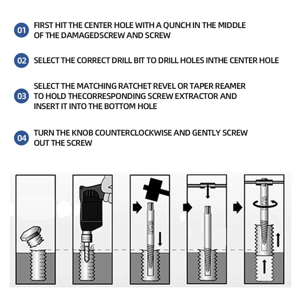 1. 3/5 шт сверхмощный стальной экстрактор: включает различные размеры винтового экстрактора для удовлетворения различных потребностей.