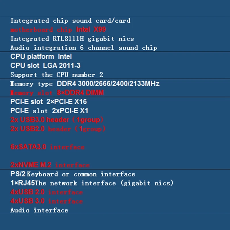 Встроенный чип: звуковая карта/карта, интегрированный: RTL8111H gigabit nicsАудио интеграции: 6-канальный звуковой чип, Процессор слот: LGA 2011-3, Поддержка в Процессор Количество: 2Тип памяти: DDR4 3000/2666/2400/2133 МГц, слот для карт памяти: 8xDDR4 DIMMРазъем PCI-E: 2xPCI-E X16, разъем PCI-E: 2xPCI-E X12x USB3.0 header(1 группа) 2x USB2.0 header(1 группа) 6xSATA3.0 интерфейс2xNVME M.2 интерфейсPS/2 клавиатура или общий интерфейс1xrj45сетевой интерфейс (gigabit nics)4xusb 2,0 интерфейс4xusb 3,0 интерфейсАудиоинтерфейсЦвет: черныйМатериал: PCBРазмер: 295x281 ммПосылка:1 х материнская платаПримечание: Цвет слота и нижней доски случайный, не принимайте указанный цветТолько вышеуказанная посылка, другие товары не включены.Примечание: светильник и различные дисплеи могут привести к тому, что цвет товара на картинке немного отличается от реального. Допускается погрешность в измерениях +/- 1-3 см.