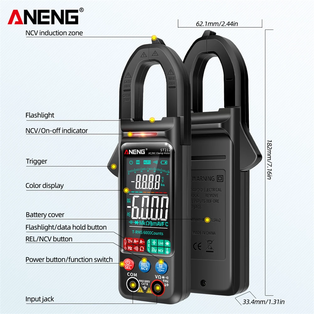 Цифровой мультиметр-зажим ANENG ST212, 6000 отсчетов, Постоянныйпеременный ток, тестер сопротивления, частоты, емкости, Бесконтактный индикатор напряжения