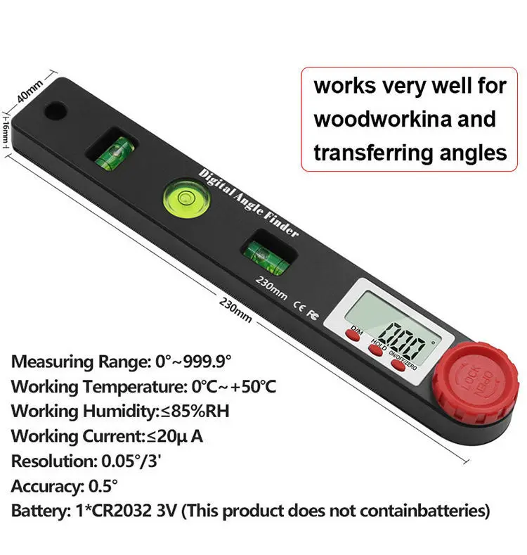 Изготовлен из легкого веса, его можно использовать для установки пильного полотна и фрезы, а также установить расстояние от ограждения маршрутизатора до бита. А также может использоваться для измерения глубины 50 мм.Материал: пластик с корпусом ABSВстроенные сильные магниты на дне.Разрешение: 0,01 мм/0,0005 дюймаТочность: ± 0,2 ммРаботает от одного аккумулятора CR2032 3 В (не входит в комплект поставки)