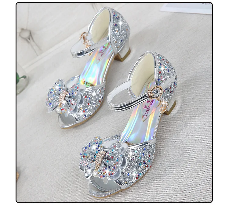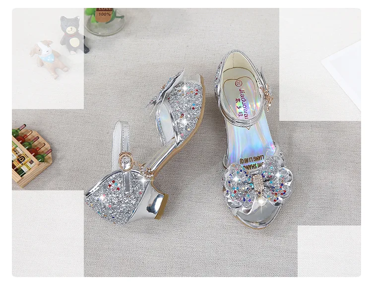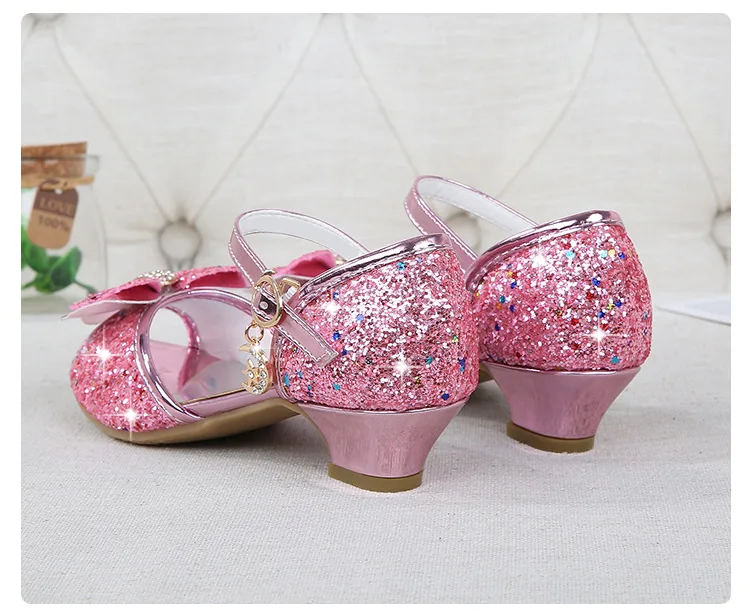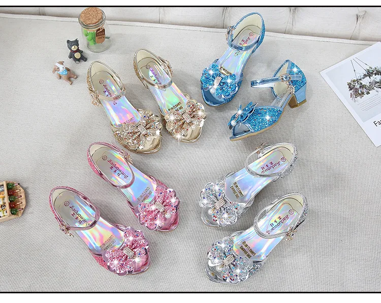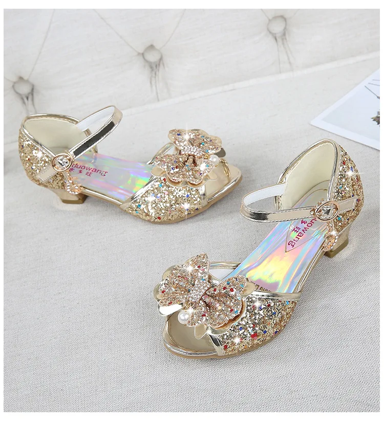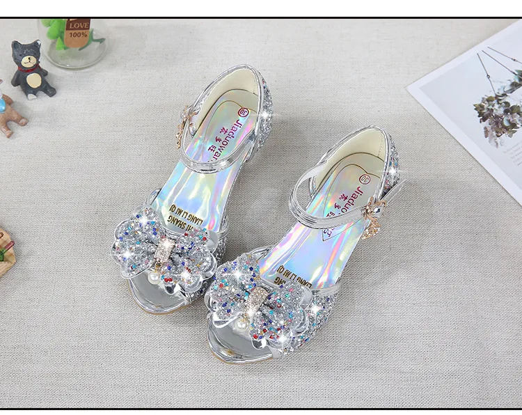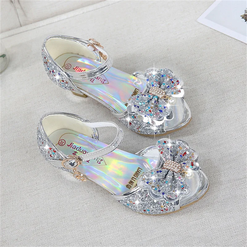 Сандалии для девочек на высоком каблуке, со стразами и бантом